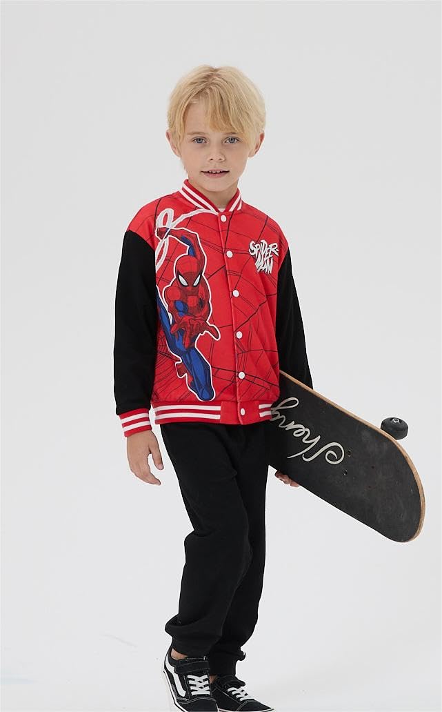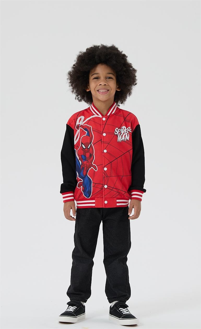 Sporty & Trendy Design: Features a bold Spider-Man print with web graphics โ perfect for little superhero fans. Classic snap-button front with striped cuffs and hem โ sporty and trendy