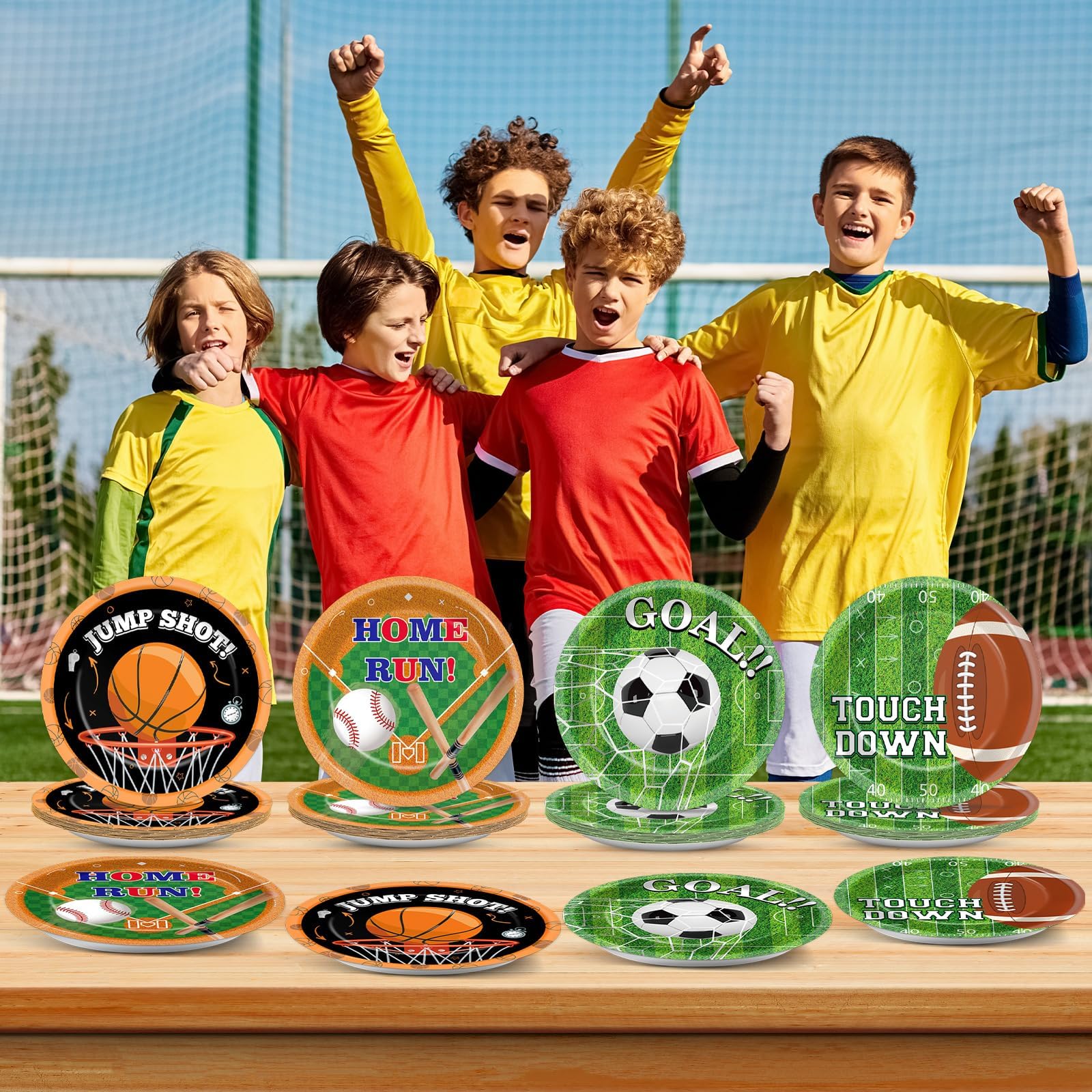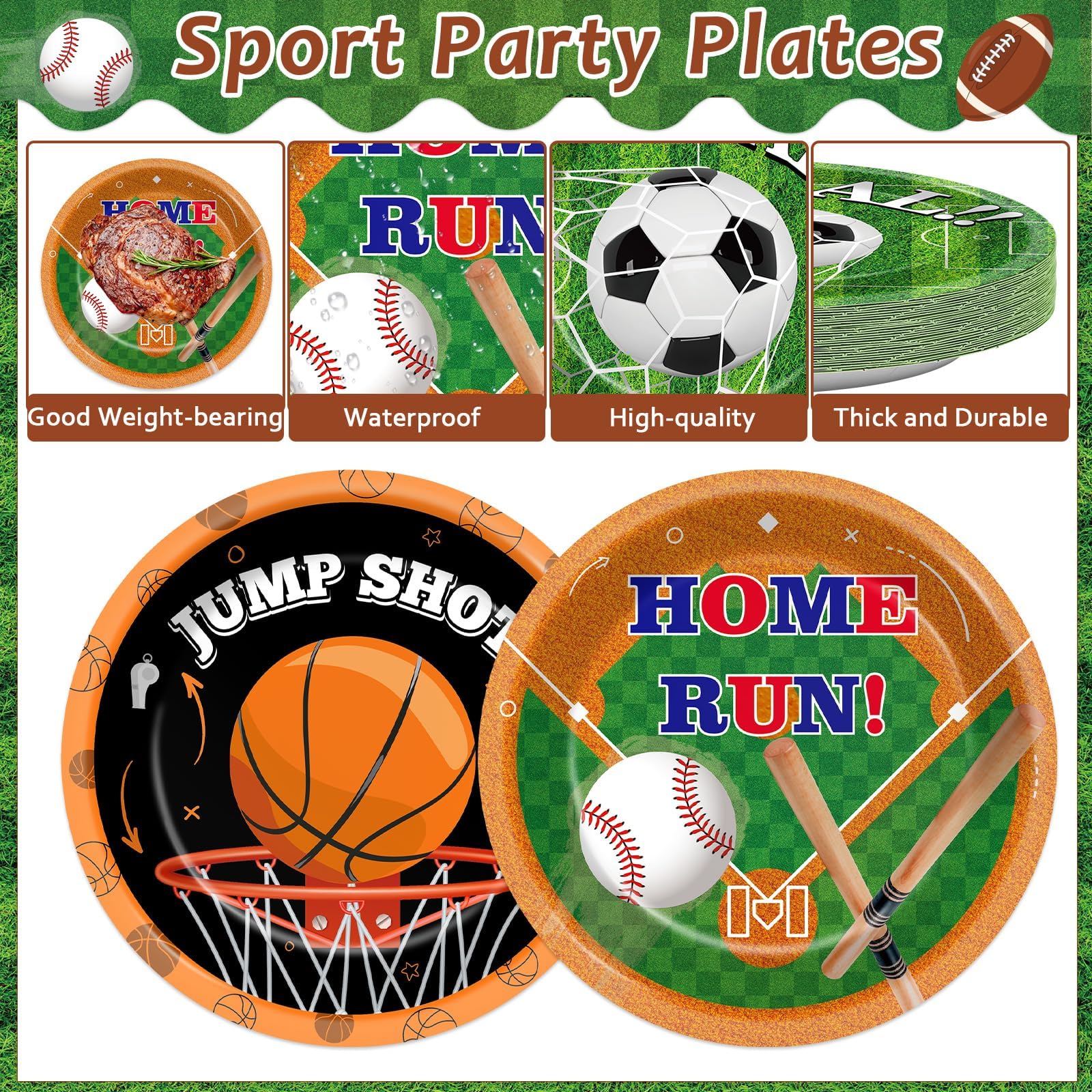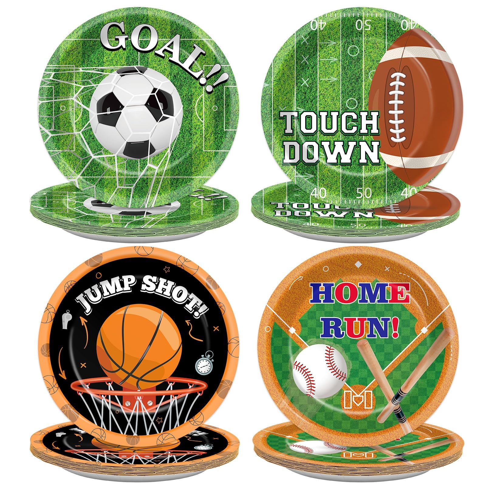 Unique Design: These sports themed paper plates incorporate colorful and attractive designs, with football, basketball,soccer, baseball fields as the background, and various balls dotted on this background. The text on each football party plate is also very eye-catching, perfect for adding a unique touch to your sports birthday theme party. They add an eye-catching touch to any celebration.