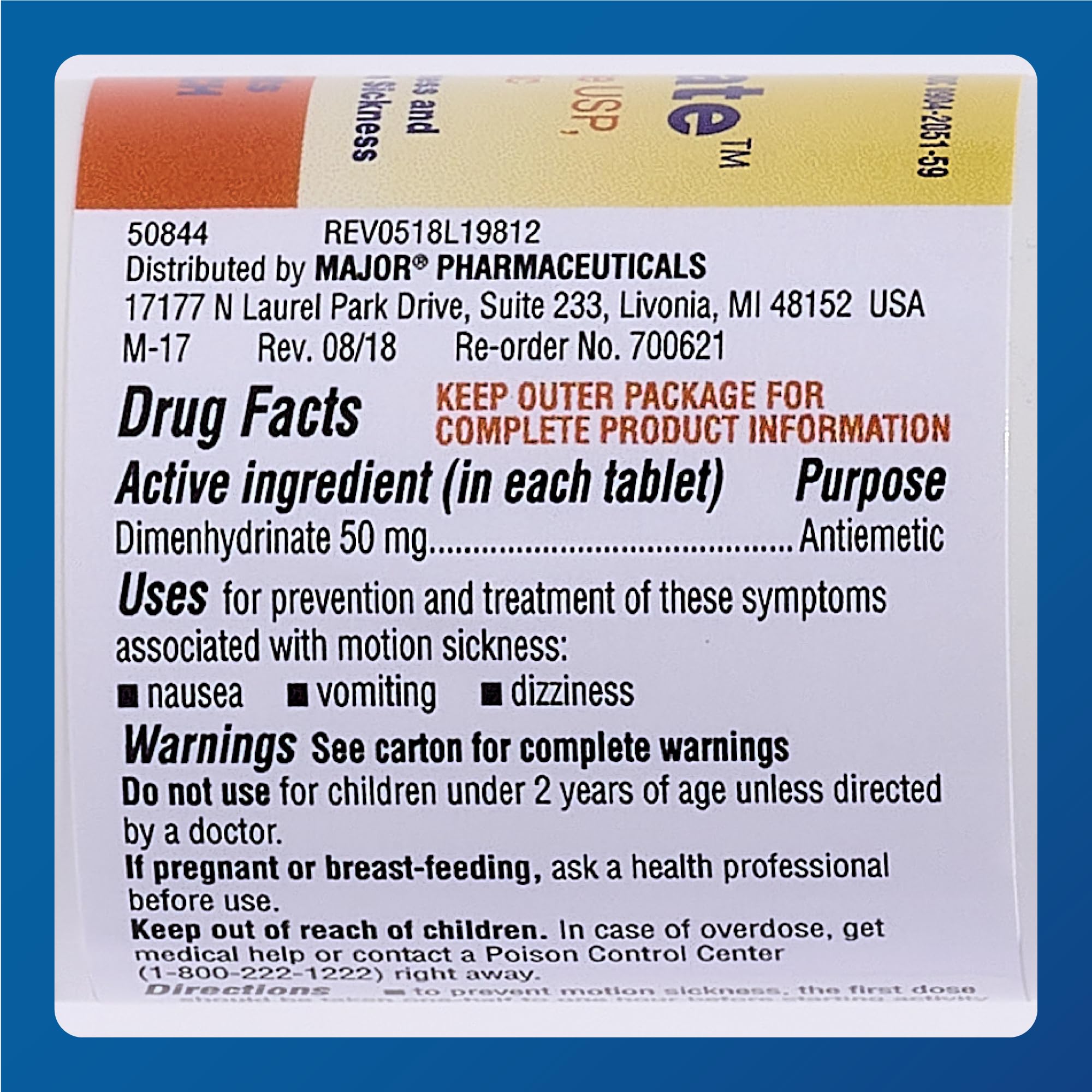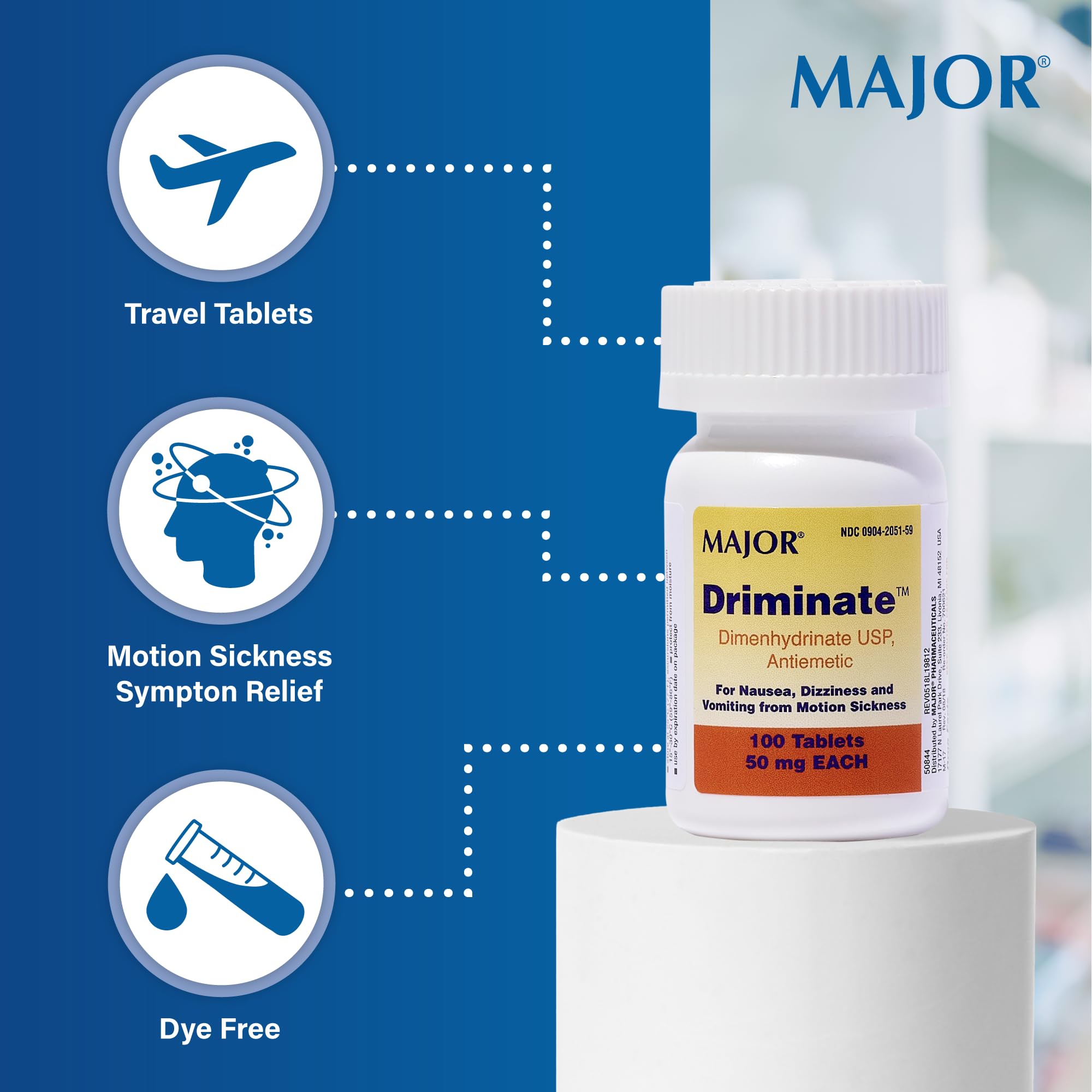 MOTION SICKNESS MEDICATION: Don't let nausea and motion sickness ruin your trip. Use Major Driminate to help counteract symptoms including nausea, dizziness, and vomiting. Free from dyes and gluten.