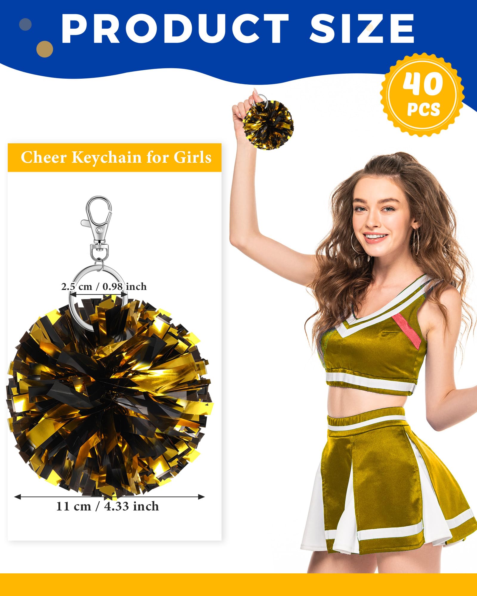 Sturdy Material and Vibrant Colors: these pom pom keychains are made of quality plastic and metal for durability, and feature nonfading, shimmering metallic black gold foil; They catch the eye, boost cheerleading spirit, and show your strong support for the team