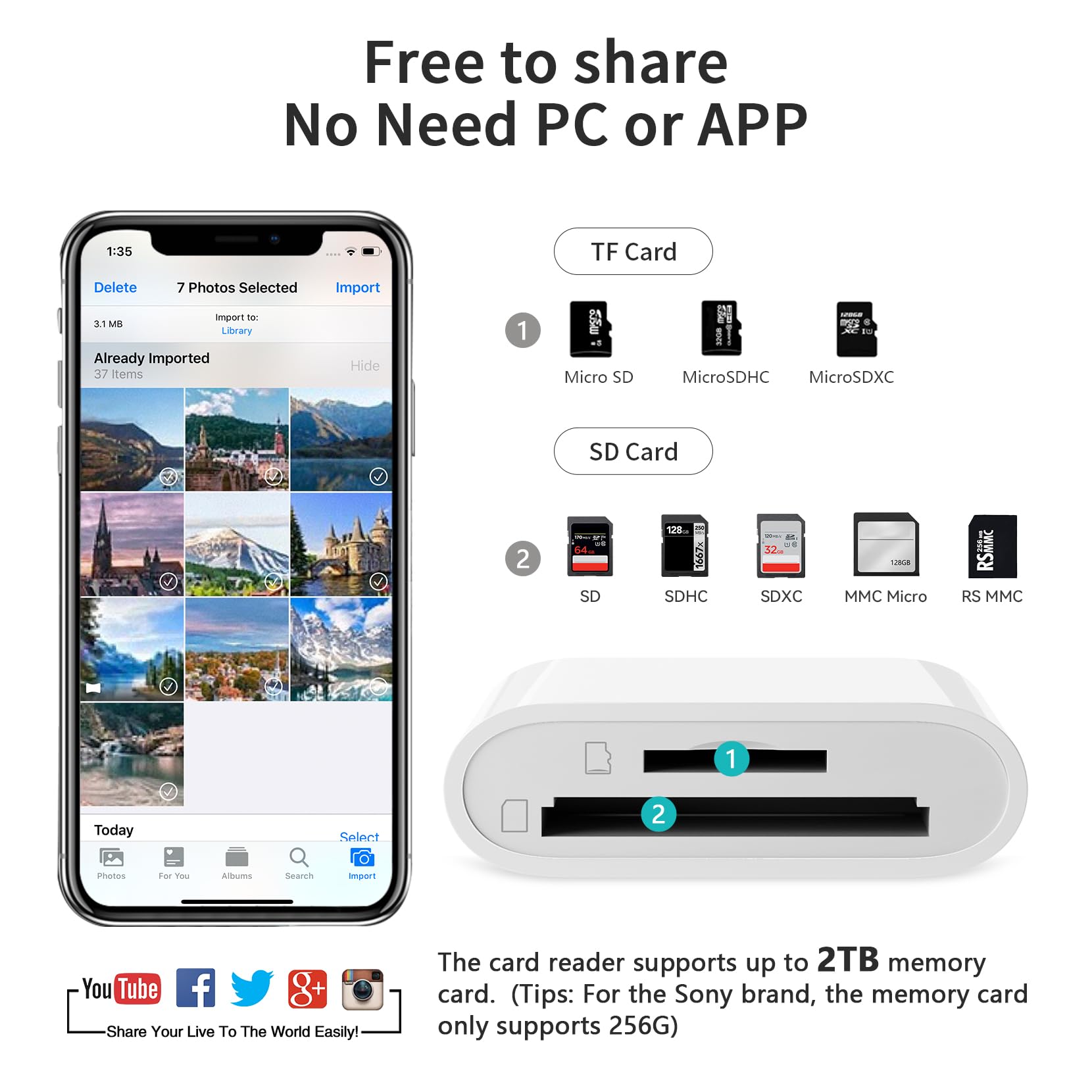 2 in 1 Double Card Slot: The sd card reader for sd and micro sd memory card, support all iPhone with iOS 9.2 and up and iPads with iOS 8.0 or later,It's easily download photos or videos from SD cards directly to the iPhone or ipad, and share videos or photos with friends and relatives anytime and anywhere.