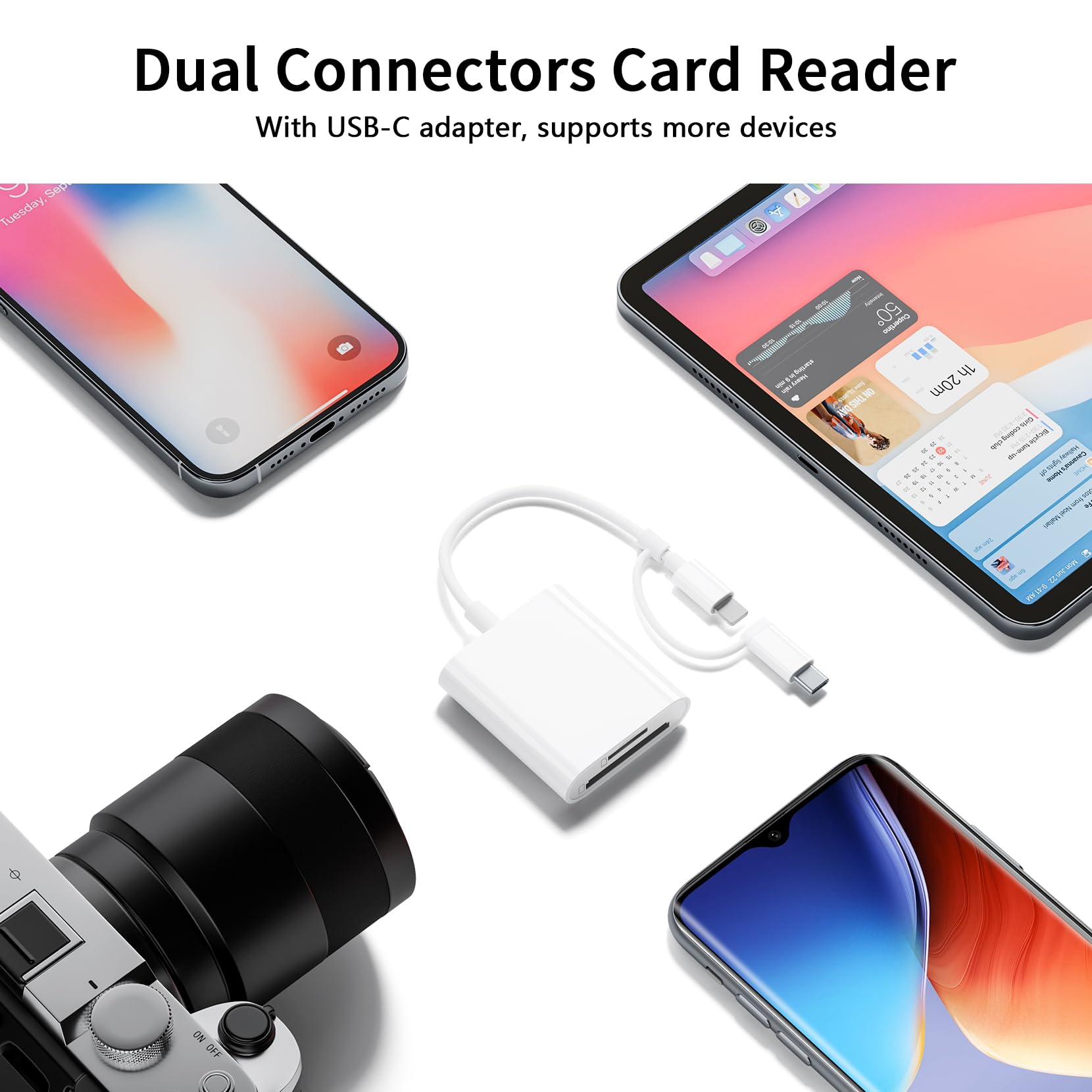 Dual Connector Design (iPhone Connector and USB-C): This SD card reader features both an iPhone connector and a USB-C connector, allowing it to work with a wide range of devices, including iPhone 5 to 14 series, as well as USB-C iPhone 15 and 16, iPad, MacBook, Mac computers, laptops, and Android devices.