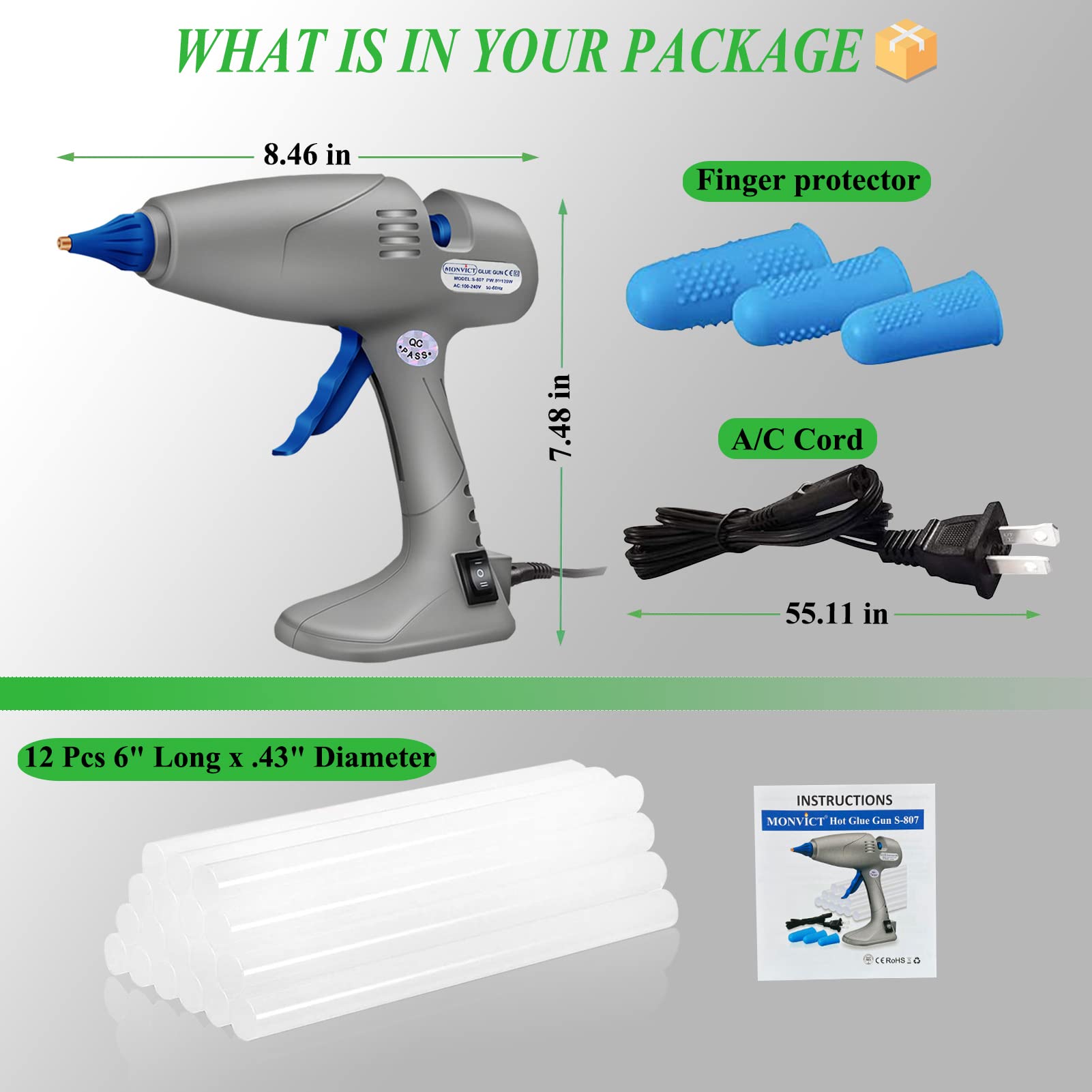 ✅【Widely Use & Warranty】- Hot glue gun with dual power settings, allowing for light and heavy-duty jobs, can be used of DIY, office, craft & arts & home & quick repairs, household jobs, festivals decoration / gifts... Equipped with 12 premium hot glue gun sticks (long: 3.93" (10cm) / diameter: 0.43" (11mm) ), 3 silicone finger protector. Please contact us for any issues, our technicians will be always there to support you.