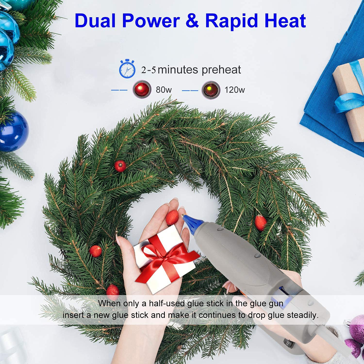 ✅【Fast Heat Up 】- This dual power hot glue gun can switch to 80 & 120W power settings, takes 1-3minutes to heat up. SAVE GLUE TIPS: The residual heat and pressure can help the glue gun continue to working even power off, so it’s better to turn off the power a few minutes before stopping use for saving the glue sticks.