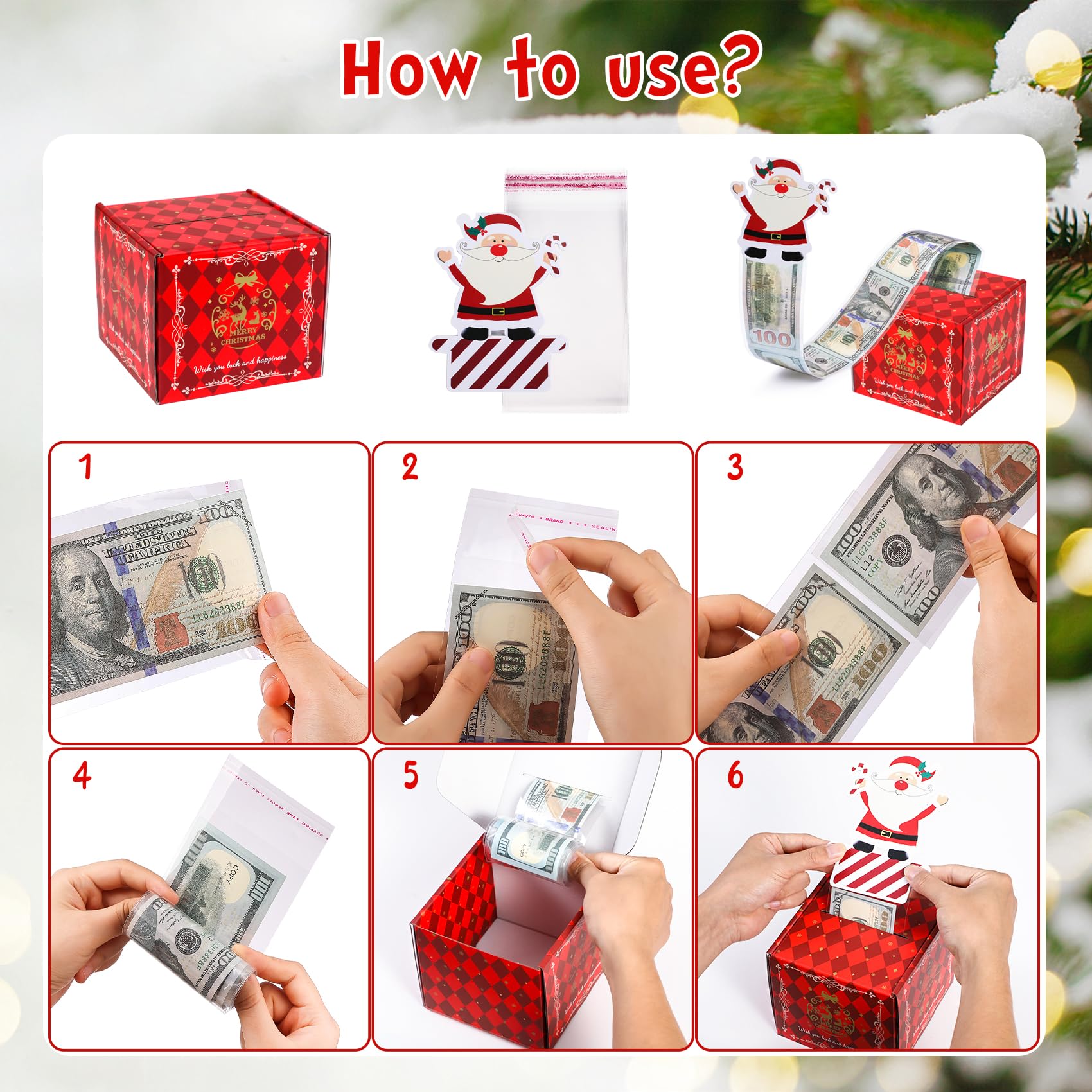 đ ăPackage includesăThe surprise money roll box includes a beautiful "Marry Christmas" money gift box, a cute "Santa Claus" card (with adhesive strips for securing plastic bags), and 100 plastic bags with adhesive tape. You can DIY this money gift box yourself and put any cash in it as a cash gift to your family and friends. You can make cash giving more interesting, which can surprise the recipient and leave some lasting impressions.