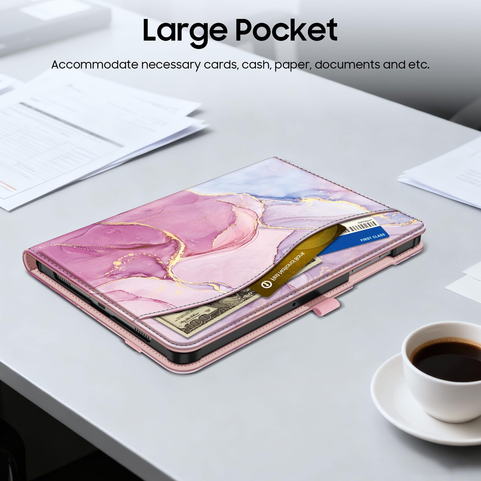 Front Pocket: A front Document Pocket to store your business cards, bank cards, notes, bills or other personal belongs while on the go
