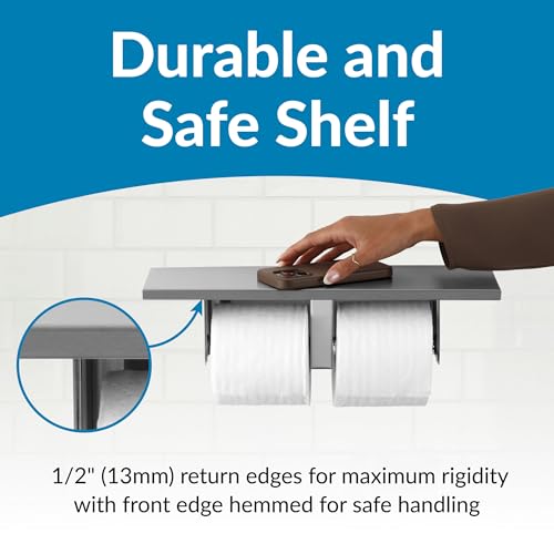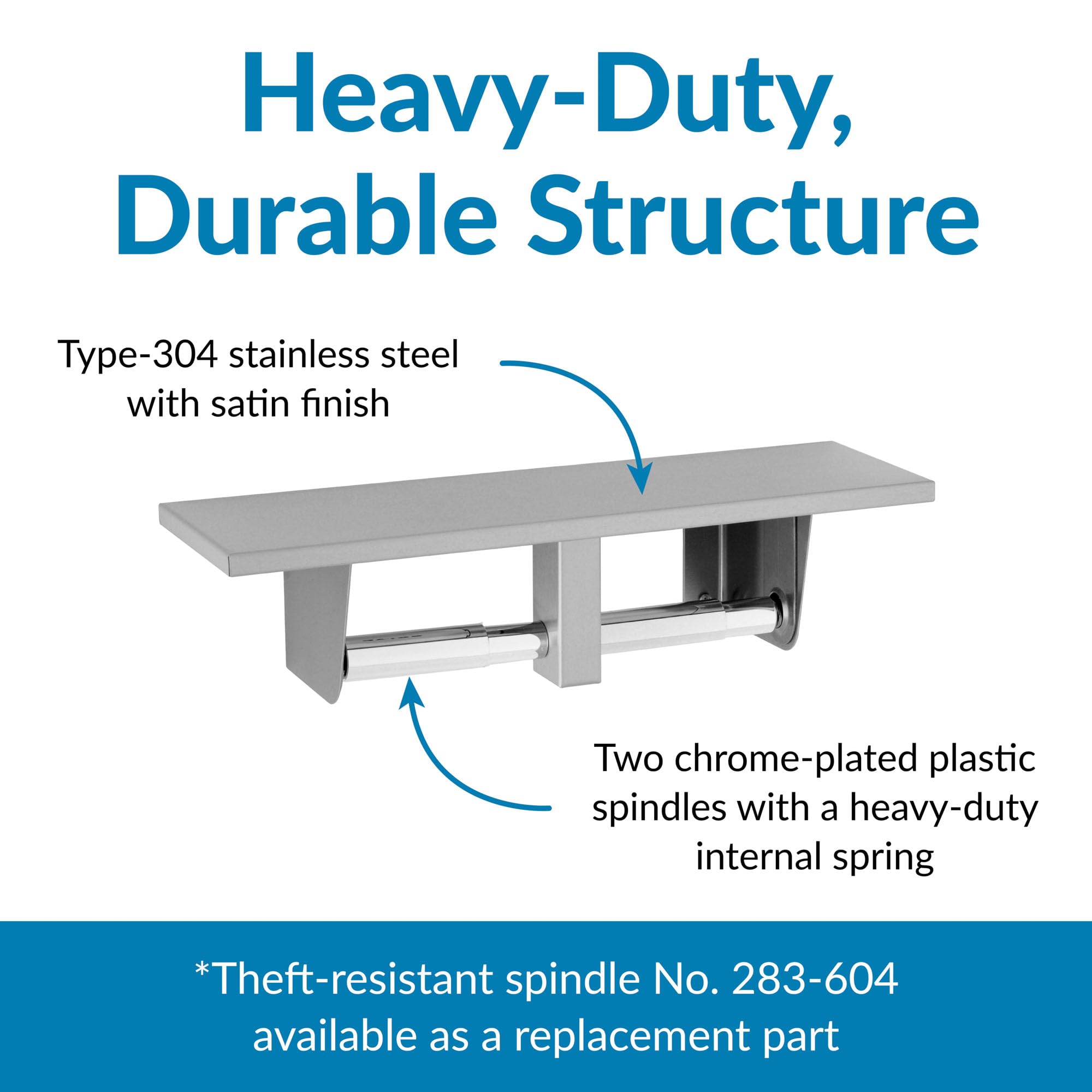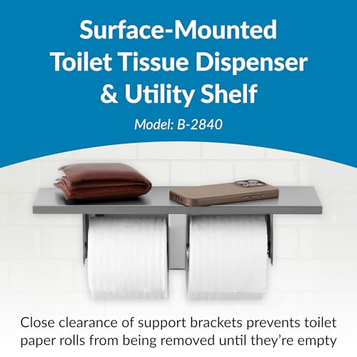 Upgrade your restroom experience with the Bobrick Toilet Tissue Dispenser featuring an integrated utility shelf. This stylish and functional unit is crafted from high-quality stainless steel with a satin finish, offering a sleek appearance that complements any commercial or public restroom décor. Its robust design ensures it stands up to daily use, making it a reliable choice for high-traffic environments such as offices, schools, hospitals, and shopping centers. The dual roll capacity means you'll never run out of toilet paper unexpectedly, providing peace of mind to both restroom users and maintenance staff. The dispenser holds two standard rolls, allowing easy access to a fresh roll when one is depleted, significantly reducing the need for constant monitoring and refills. This feature ensures your restroom remains fully stocked, even during peak usage times. Adding to its functionality, the built-in utility shelf offers a convenient spot for restroom visitors to place their belongings, such as phones, wallets, or keys, making it a thoughtful and practical addition. This simple yet effective feature enhances the overall user experience, creating a more comfortable and organized environment. Installation is straightforward, and the dispenser can be securely mounted on various wall surfaces, making it a versatile choice for different restroom layouts. The theft-resistant design helps prevent roll removal until they are completely used, ensuring cost-effective operation and reducing waste. For added security, an optional theft-resistant spindle is available. Choose the Bobrick Toilet Tissue Dispenser with Utility Shelf for a blend of style, convenience, and functionality. It’s an ideal solution for maintaining a well-organized, fully stocked, and user-friendly restroom, offering durability and practicality that stand the test of time.