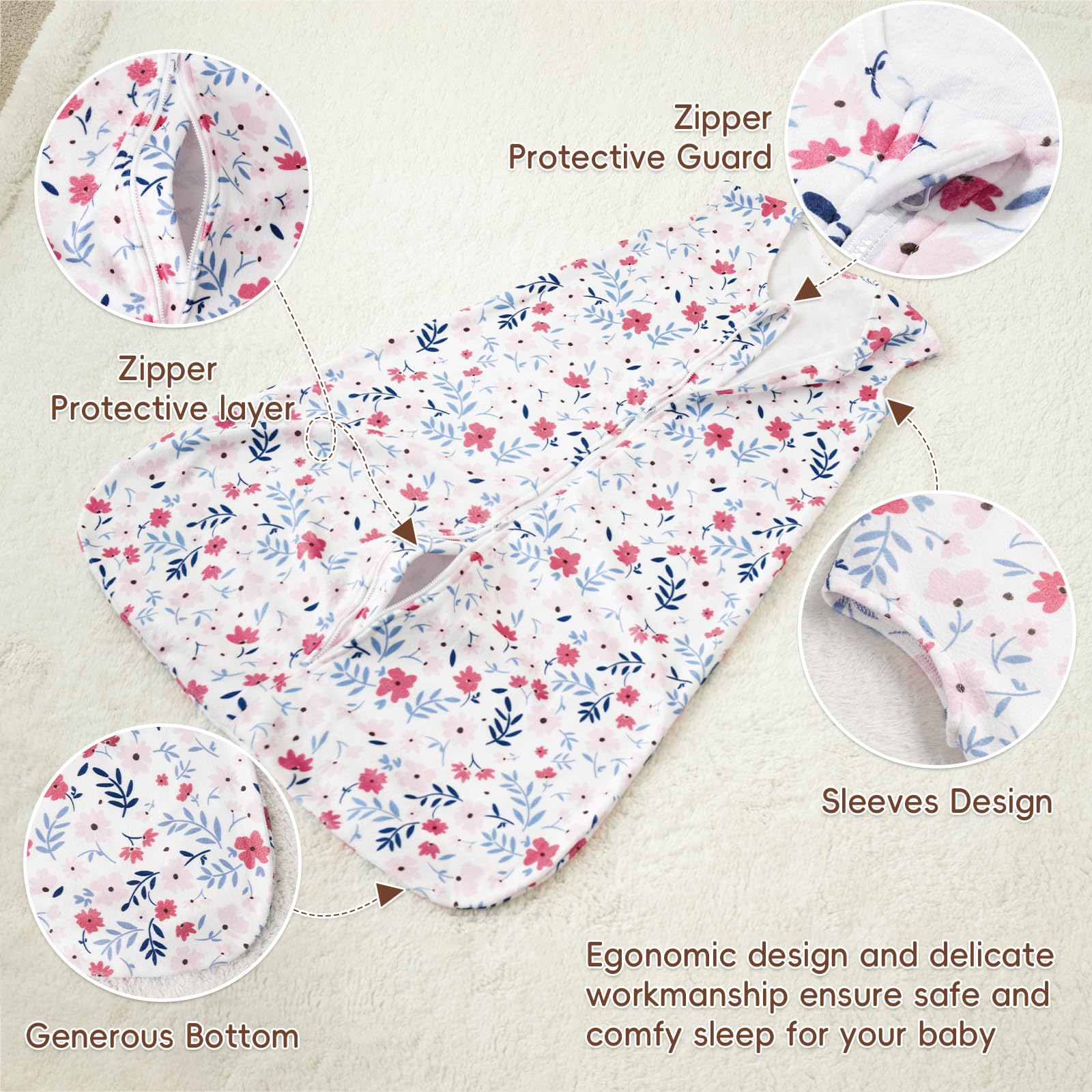 Generous Bottom Space and 2-way Zipper: Our sleeping bags have generous bottom space that allows your baby to kick and move their legs freely. The 2-way zipper makes it easy for you to change your baby's diaper. Our sleep sacks come with protective layers that prevent the zipper from accidentally scratching your baby. The sleeveless design allows free movement of your baby's arms, making it easier for them to roll over and sleep comfortably.