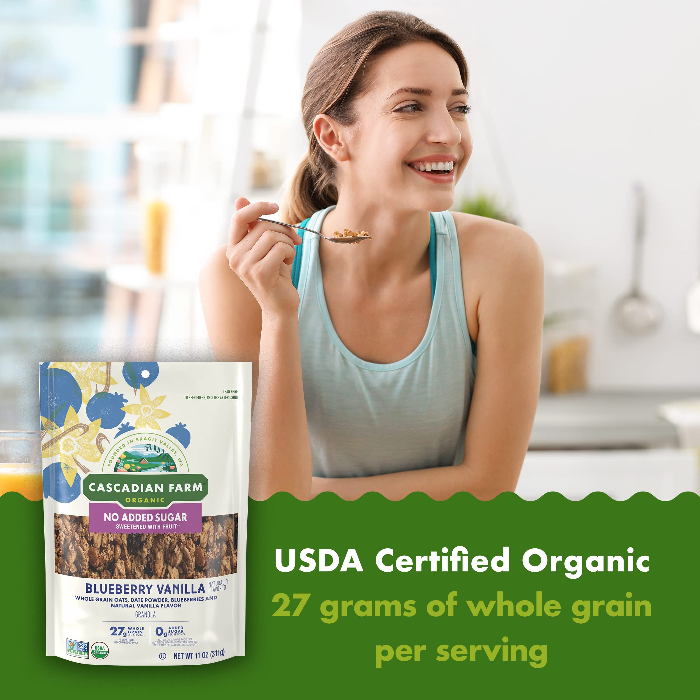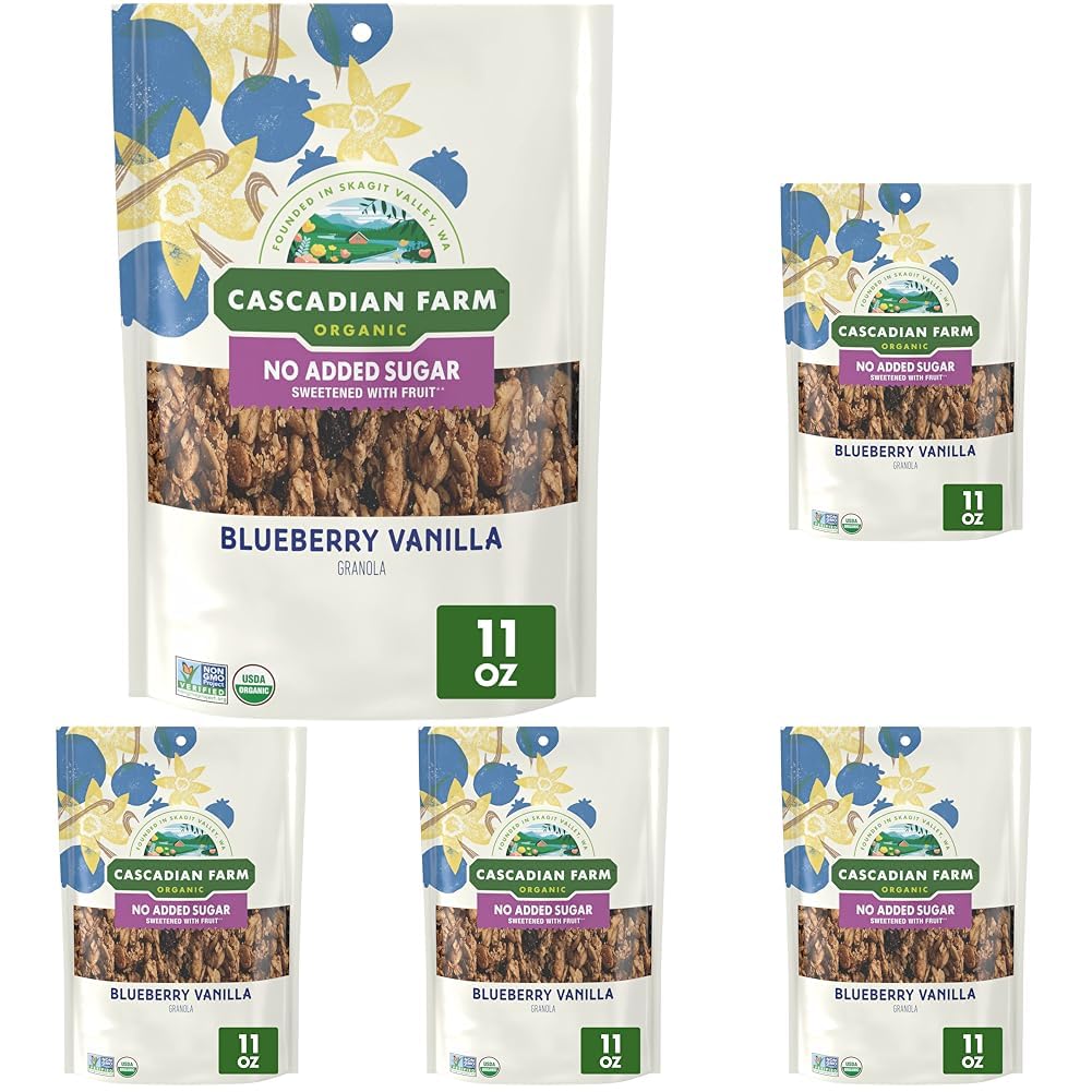 CONTAINS: One plastic resealable pouch of crunchy Cascadian Farm Organic Granola, No Added Sugar, Blueberry Vanilla Cereal, 11 oz; Perfect for instant snacking or a part of breakfast and meals