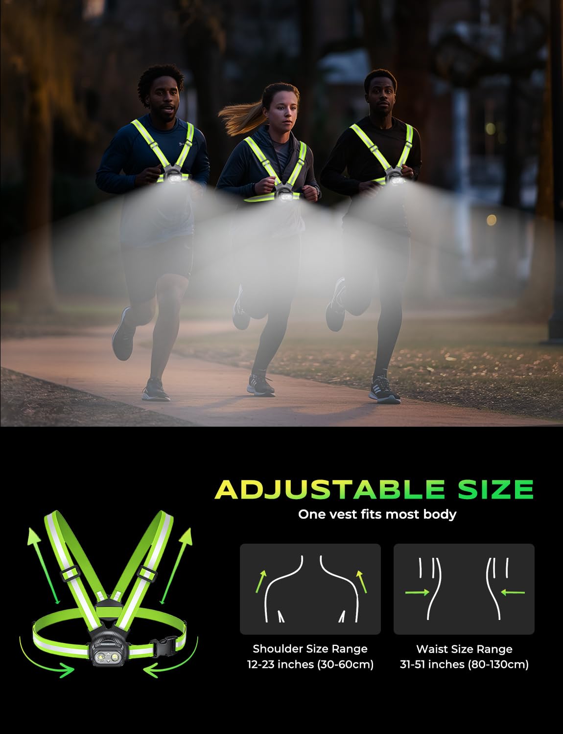 【Comfortable & Adjustable Fit】 Enjoy customized comfort with adjustable buckles and elastic straps accommodating shoulder widths of 12-23 inches (30-60cm) and waist sizes of 31-51 inches (80-130cm). This running light vest is designed wider dual-shoulder strap, which distribute weight evenly and enhances stability and comfort, perfectly resolving the head fatigue caused by traditional headlamps during long-distance running.