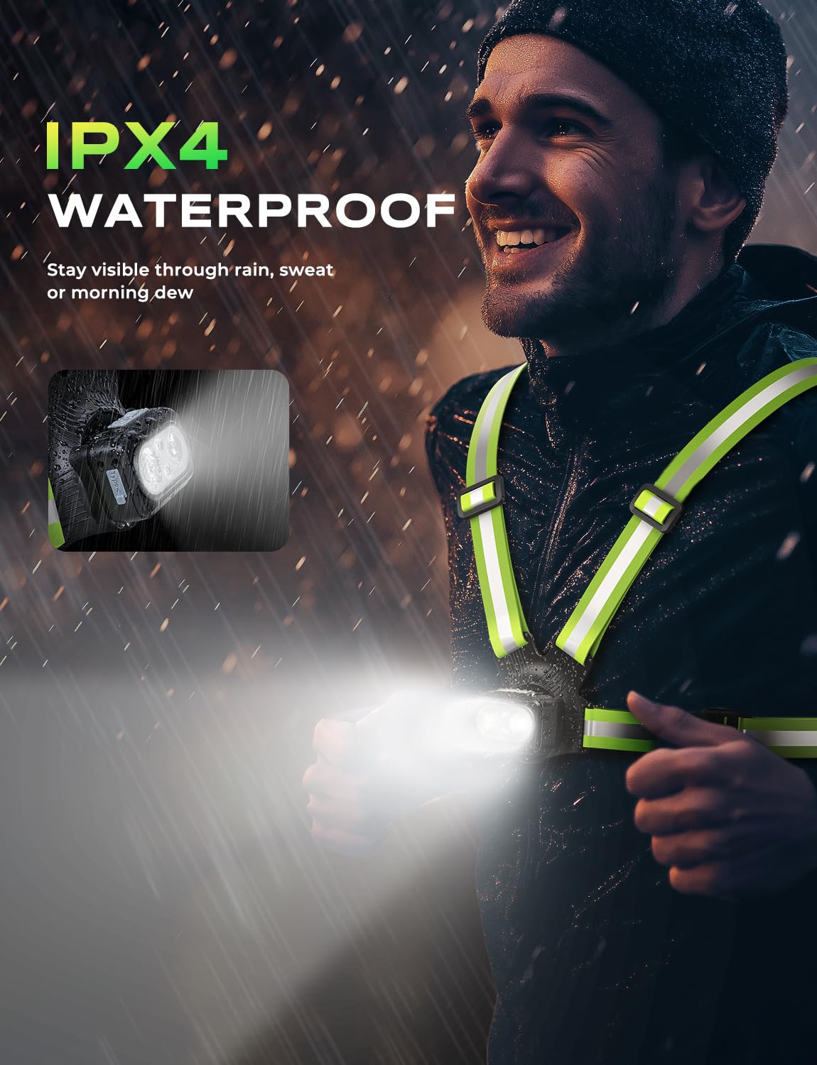 【IPX4 Waterproof & Multi-Use】 Built to withstand rain, sweat, and splashes, the IPX4 waterproof rating ensures durability in various weather conditions. Whether running, cycling, hiking, walking the dog or other outdoor activities, this running reflective gear offers a more comfortable, flexible and convenient lighting solution than headlamps.