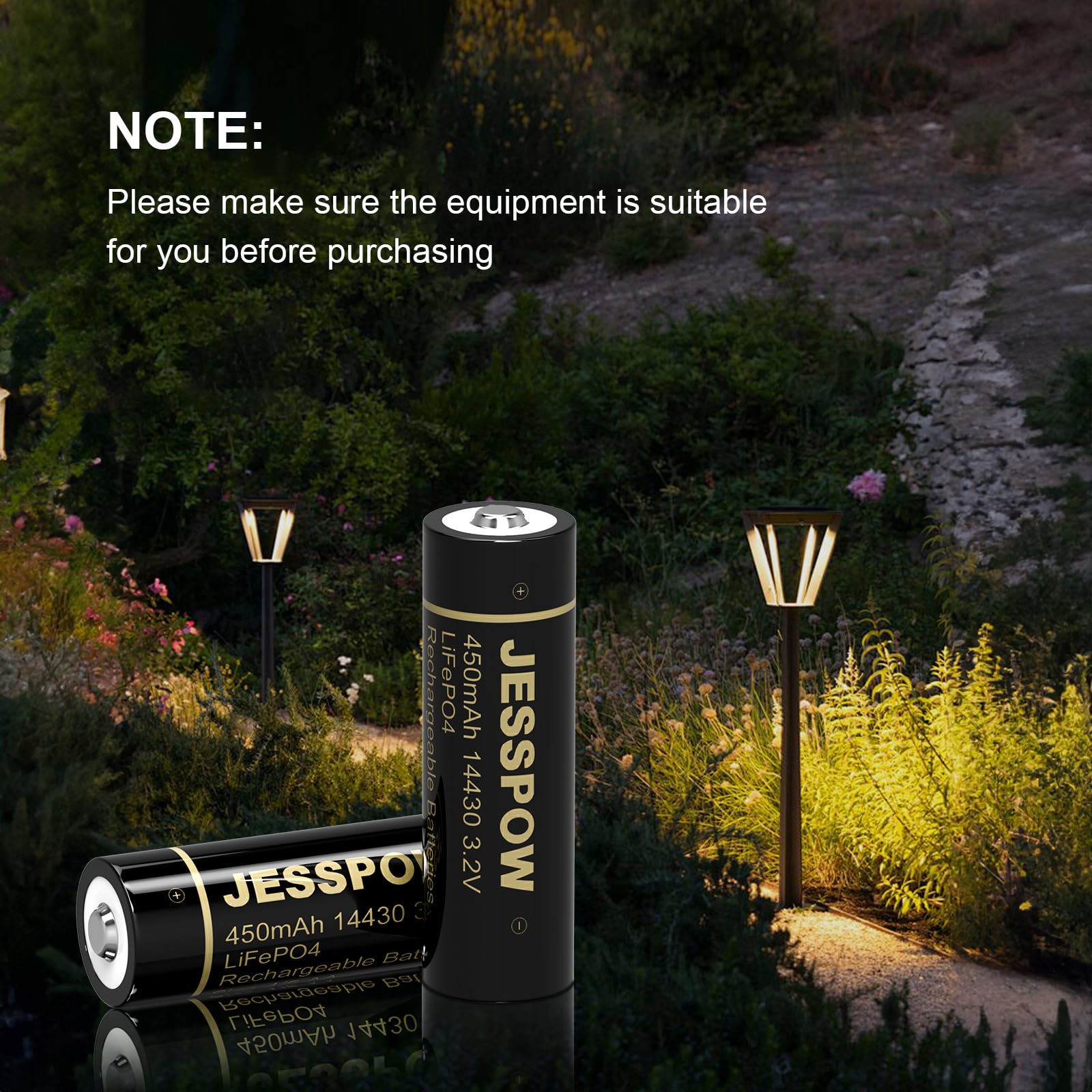 Important NOTE - 14430 Lithium-Iron Phosphate LiFePO4 battery : 3.2 volt, 450mAh. Height: 1.7 inch , Diameter: 0.55 inch.This is NOT a AAA-size battery and does not fit to replace a AAA-size rechargeable .This is NOT a AA-size battery and does not fit to replace a AA-size rechargeable battery, this is a 4/5AA size battery. This is SHORTER than a AA-size battery.Note: Please Check the Size and VOLTS Before You Place an Order.