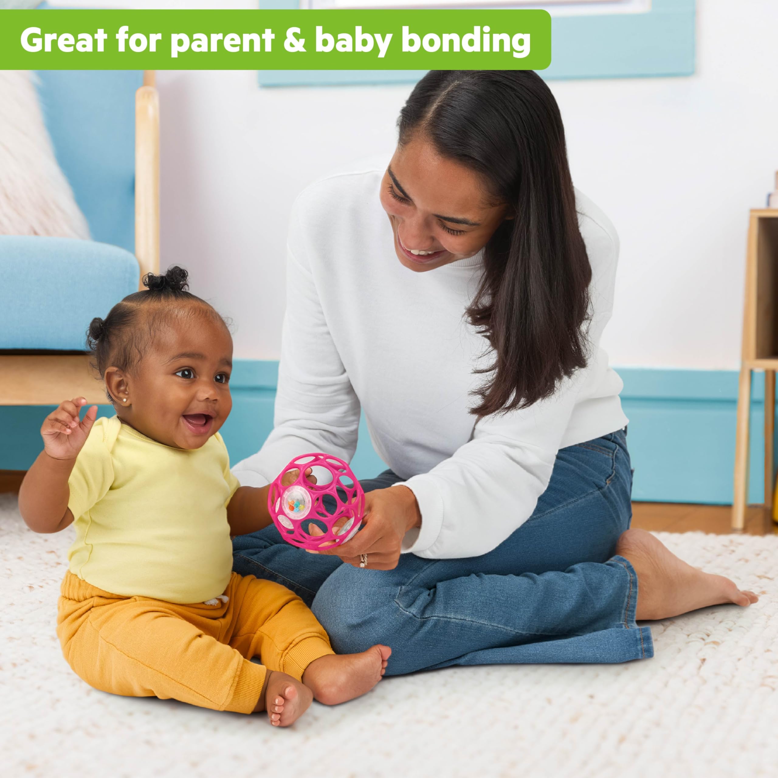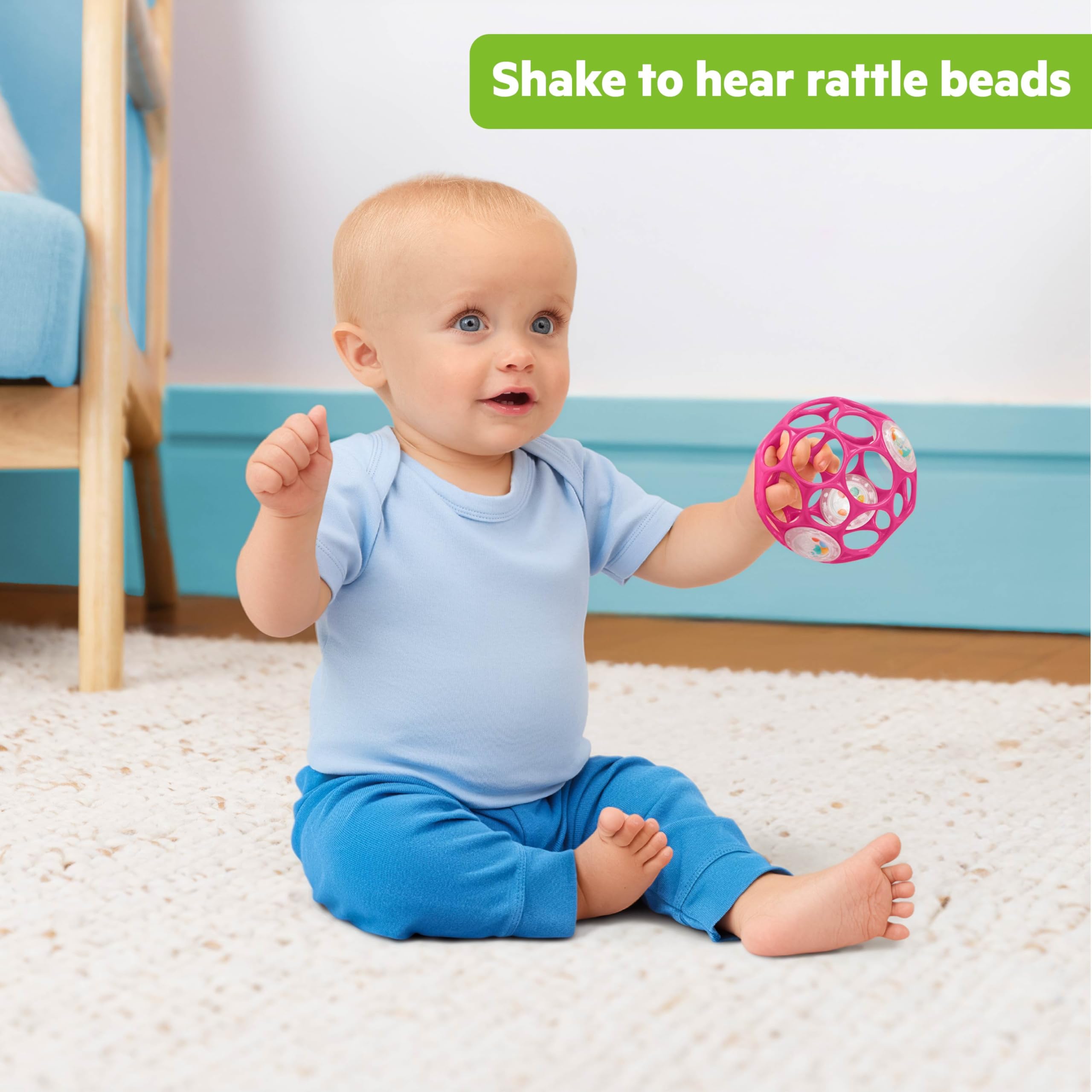 Get ready to shake, rattle, and roll with the Oball Rattle by Bright Starts! This bright pink baby rattle is designed to capture baby’s attention and provide multisensory play. The flexible and bendable Oball design makes it easy for tiny hands to grasp, supporting fine motor skill development. There’s no wonder we’ve sold over 16 million of them! Baby can shake the ball to stimulate auditory senses and enjoy exciting cause & effect play. Plus, baby will love the thrill of the chase... and working those gross motor skills, too! Whether at home or on the go, the Oball rattle is perfect for keeping baby entertained with its lightweight and portable design. Add to your collection of baby toys, ideal for newborns and up. Great gift for any occasion, from baby showers to birthdays and holidays. Toss this ball rattle into your diaper bag, and you’ll be ready for whatever the day brings. Your little noisemaker will always have a ball!