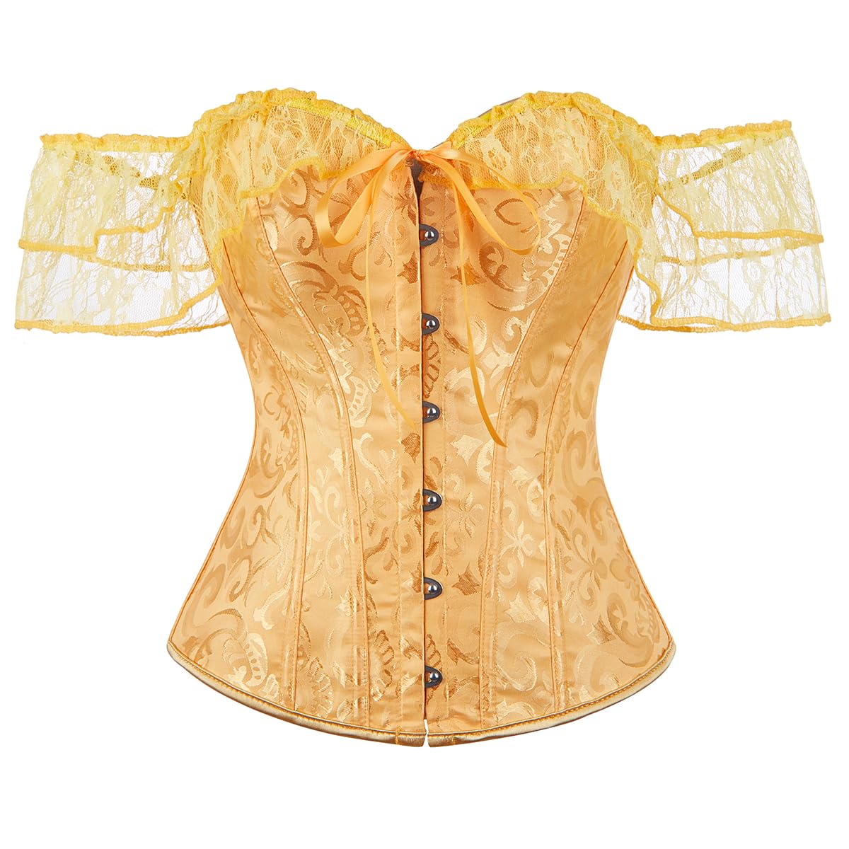 Description SHYMMUO Corset Top for Women Renaissance Steampunk Bustier Top Sexy Lace Up Corset Top Festival Pirate Halloween Costume Turn heads and shape curves in this stunning off-shoulder corset top for women. Made from elegant satin jacquard fabric with intricate vintage-inspired patterns, this lace-up bustier combines timeless style with modern comfort. Featuring off-the-shoulder lace sleeves, a front busk closure, and an adjustable lace-up back, this structured steampunk corset top is both fashionable and functional. Whether you're dressing up for a renaissance festival, a burlesque show, a gothic party, or need a bold corset costume for Halloween, this piece is a versatile addition to any corset lover’s wardrobe. With built-in supportive steel boning, this sexy lingerie top enhances your natural curves while offering waist-slimming definition. Pair it with a flowing skirt, leather pants, or layered under a jacket to create countless striking looks. This vintage corset top is more than just shapewear—it’s a style statement. Please choose corset according to your waist and bust size Size Chart X-Small Corset Fit Waist: 23-25" , Bust: 30-32" Small Corset Fit Waist: 25-27" , Bust: 32-34" Medium Corset Fit Waist: 27-29" , Bust: 34-36" Large Corset Fit Waist: 29-31" , Bust: 36-38" X-Large Corset Fit Waist: 31-33" , Bust: 38-40" XX-Large Corset Fit Waist: 33-35" , Bust: 40-42" 3X-Large Corset Fit Waist: 35-37" , Bust: 42-44" 4X-Large Corset Fit Waist: 37-39" , Bust: 44-46" 5X-Large Corset Fit Waist: 39-41" , Bust: 46-48"