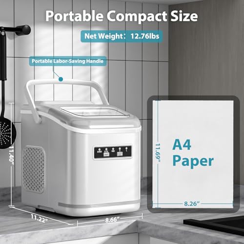 Portable copmact mini size ice maker machine: This countertop ice maker weighs 14.08 pounds with handle. The small ice maker measures D11.57*W8.74*H11.42 inches. This' mini portable ice maker is perfect for homes,offices,camping, and parties