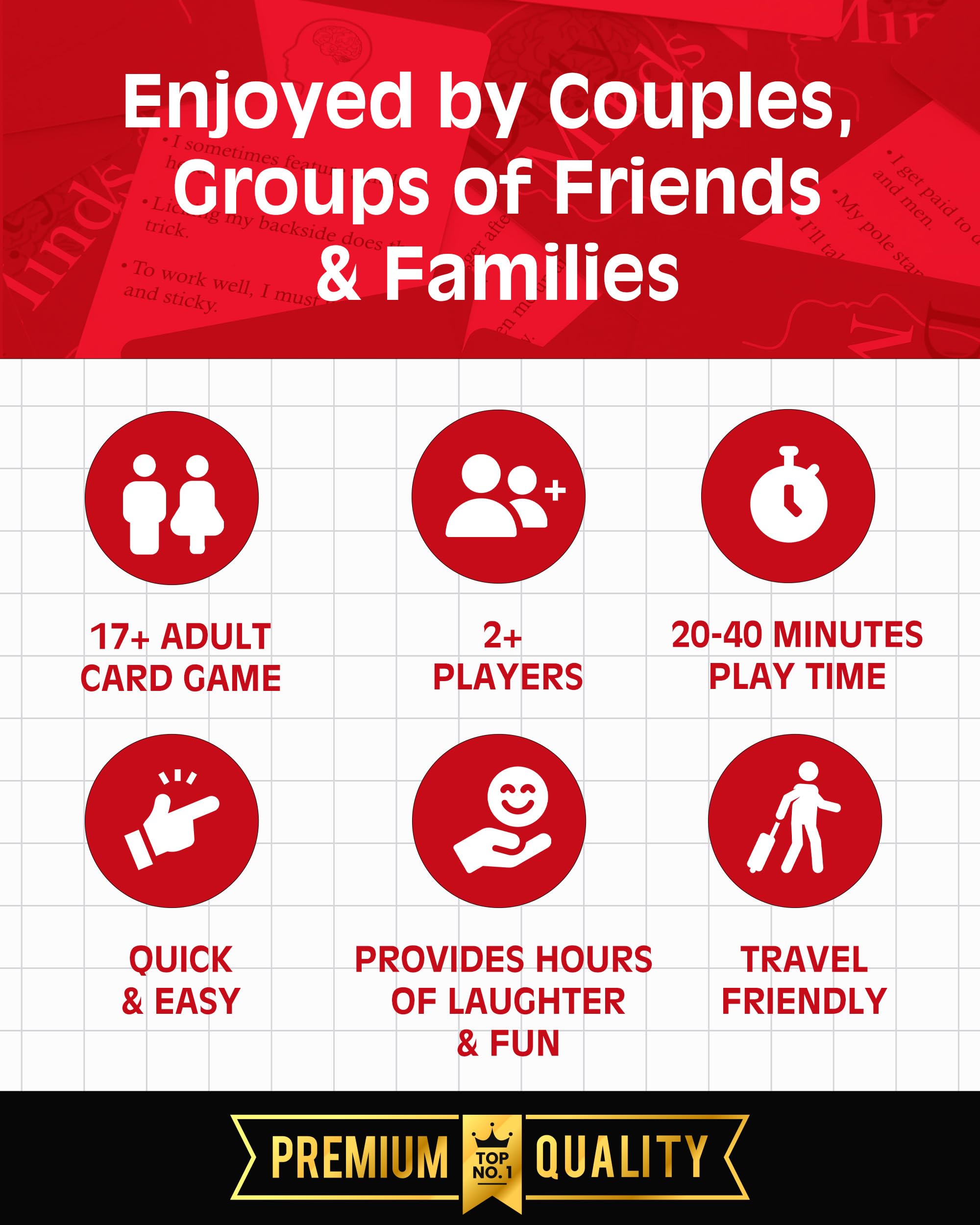 What's Inside: This adult party game includes 112 total cards in a convenient travel pack. 56 game cards (5 naughty clues and one clean answer per card) plus 56 scoring cards including the following: (5) Wild Cards, (5) Take Two, (5) Lose A Card, (6) “-“ Cards, (7) "D“ Cards, (7) “I“ Cards, (7) “R“ Cards, (7) “T“ Cards, (7) “Y“ Cards