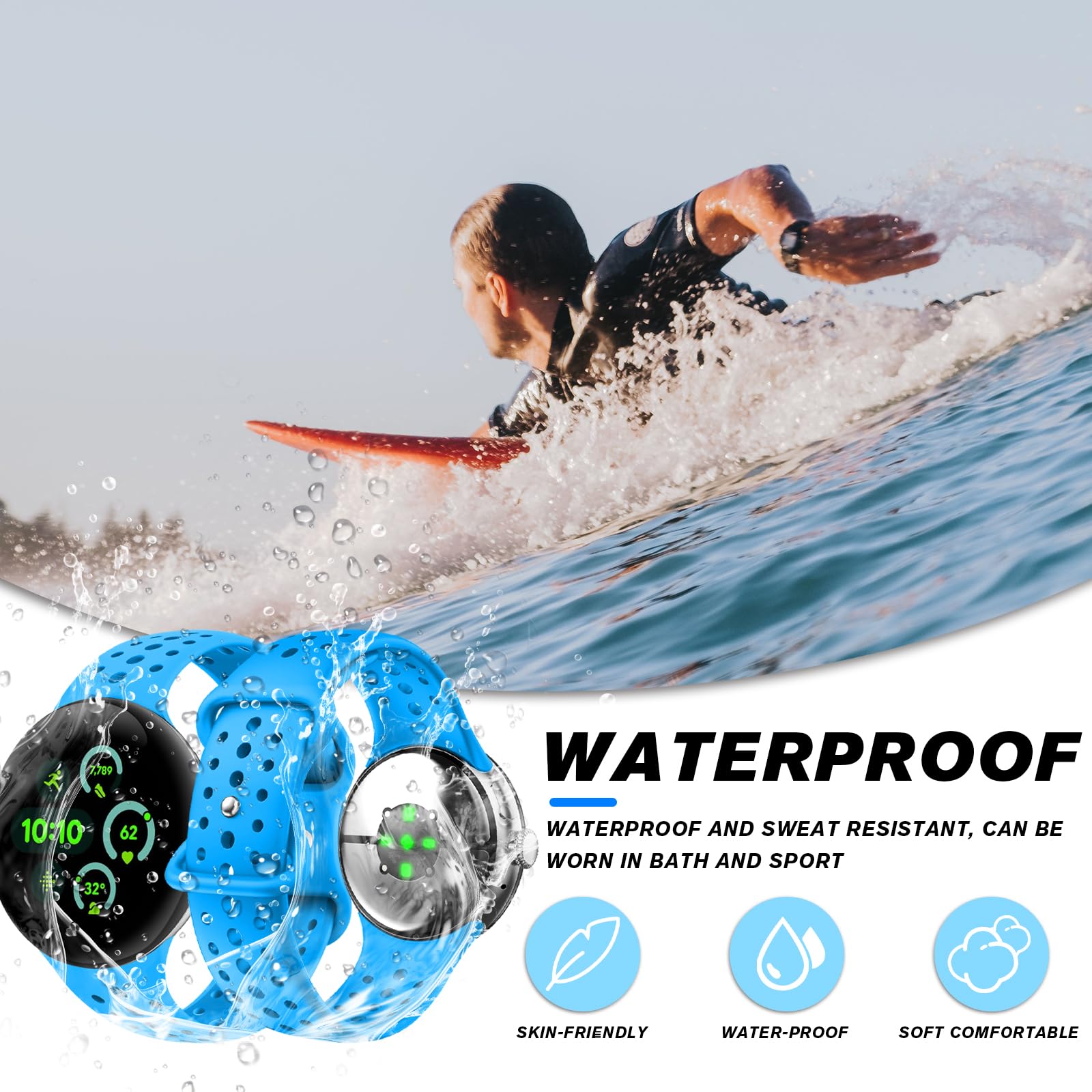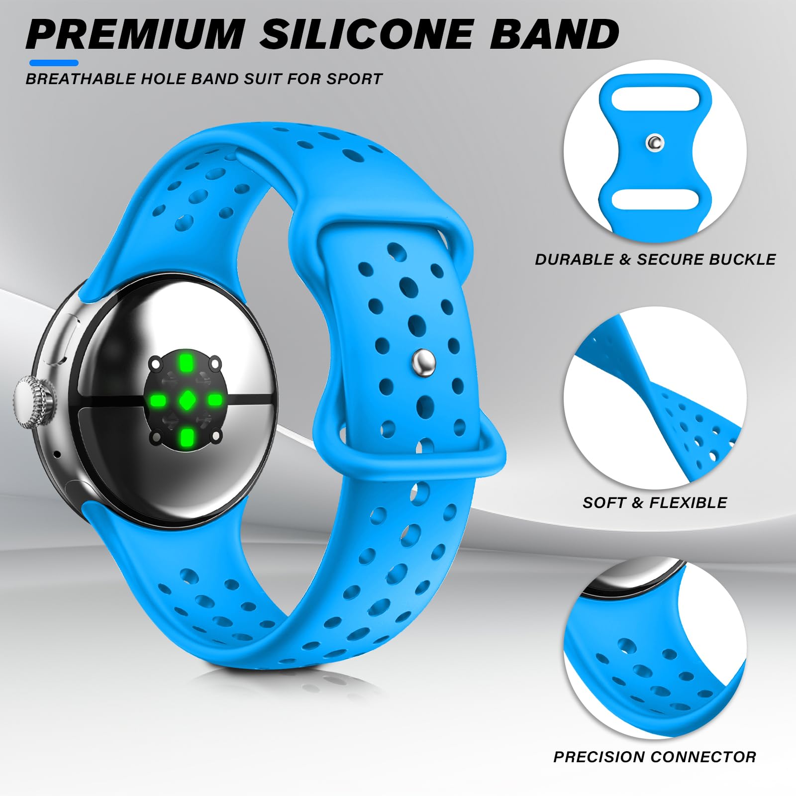 【Premium Silicone Material】The stylish workout strap compatible with Google Watch band are made of soft & durable silicone material. The watch band make from premium silicone, prevents skin from irritation.