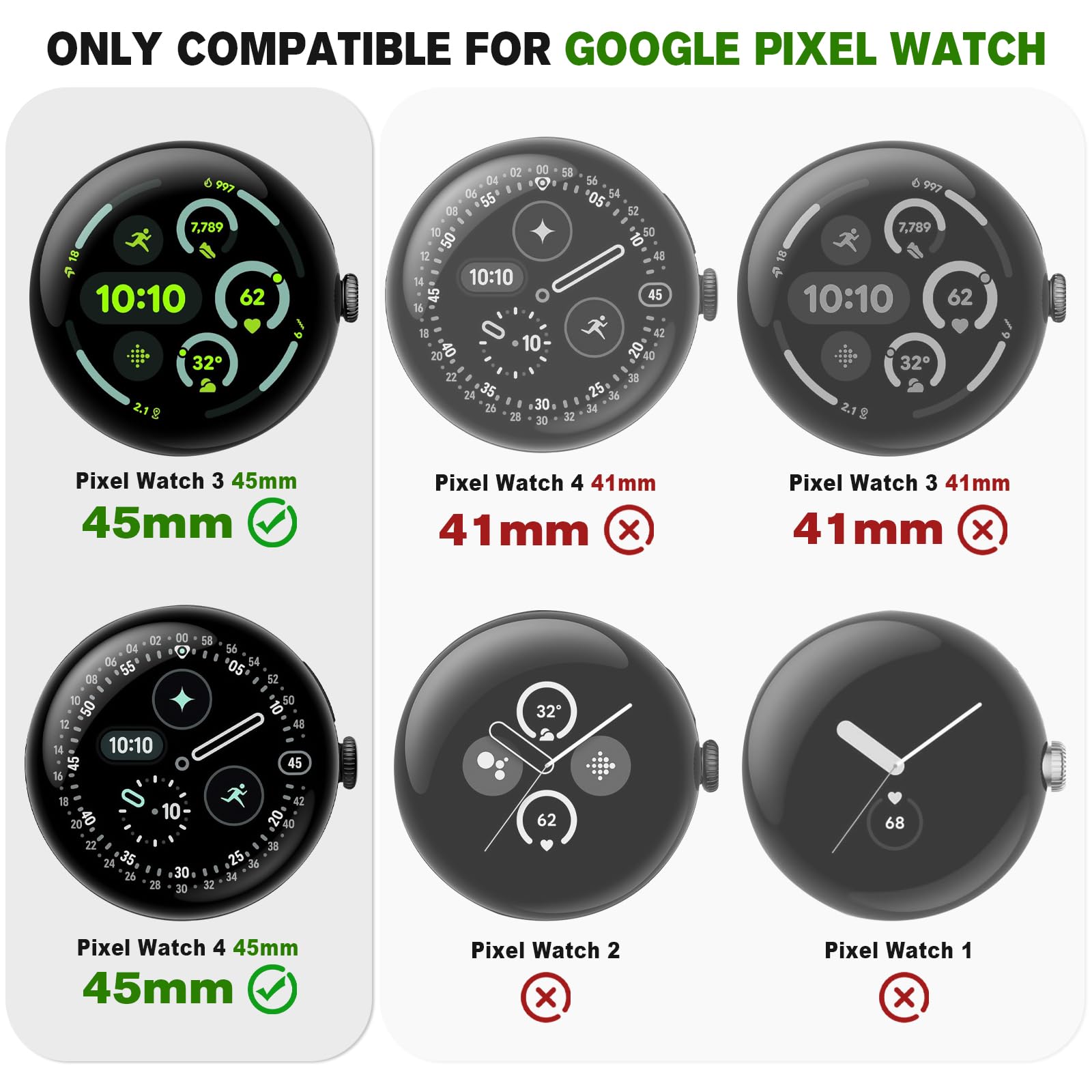 【Compatible Models】: Only compatible for Google Pixel Watch 4 45mm, Google Pixel Watch 3 45mm. NOTE:Please check your watch model before ordering for avoiding a wrong model.