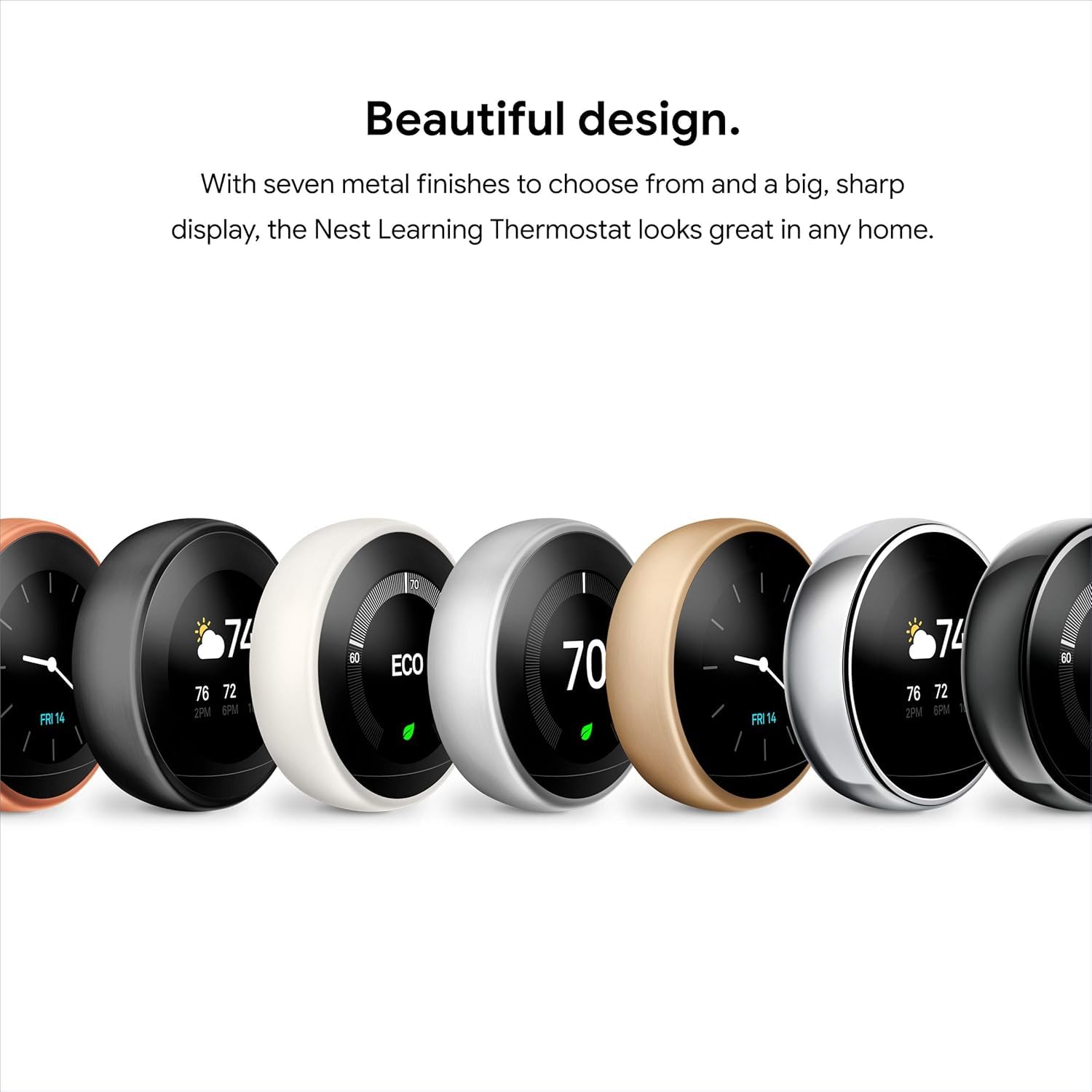 The Nest Learning Thermostat is a smart thermostat that learns your schedule and programs itself to help save energy. You can control it from anywhere with the Nest app, and it Compatible with Alexa and Google Assistant so you can adjust the temperature with your voice. And it’s beautifully designed, with a big, bright display and metal finishes to suit any home’s style. [1] Remote control and mobile notifications require working internet and Wi-Fi. [2] Alerts can notify you of a potential issue with eligible HVAC systems. They’re meant to provide helpful information, not an endorsement, representation, or warranty of any kind about the health of your HVAC system. Alerts aren’t intended to replace a diagnosis by a qualified HVAC professional. [3] Energy savings are not guaranteed and depend on energy usage, weather, and other factors. [4] Voice control requires a compatible device, and working internet and Wi-Fi. [5] Independent studies showed that Nest thermostats saved people an average of 10% to 12% on heating and 15% on cooling. Based on typical energy costs, we’ve estimated average savings of $131 to $145 a year. Individual savings are not guaranteed. [6]Nest Renew requires 3rd generation Nest Learning Thermostat, Nest Thermostat E, or the newest Nest Thermostat (sold separately), connected to a Google account. Only available in areas served by major continental US grids. Only available for customers on certain electric utility time-of-use rates. Learn more at support.google.com/googlenest/answer/11156316. [7]Adjustments only shift electricity usage from your heating and cooling.