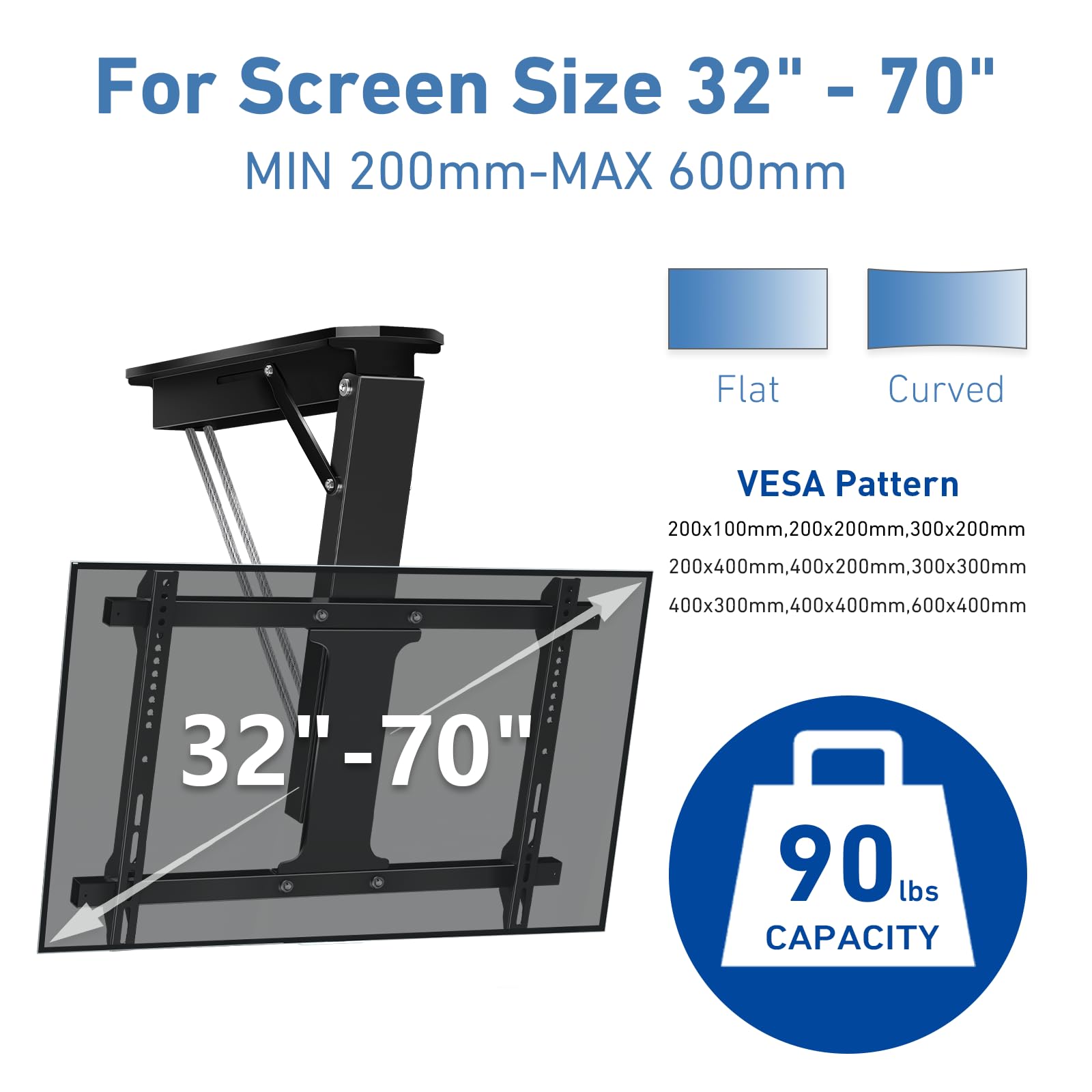 Mount for 32" - 70" TV - This ceiling TV mount fits for 32-70 inch flat and curved TVs and compatible with VESA patterns 200x100 millimetres, 300x200 millimetres, 400x200 millimetres, 400x300 millimetres, 200x400 millimetres, 200x200 millimetres, 300x300 millimetres, 400x400 millimetres or 600x400 millimetres