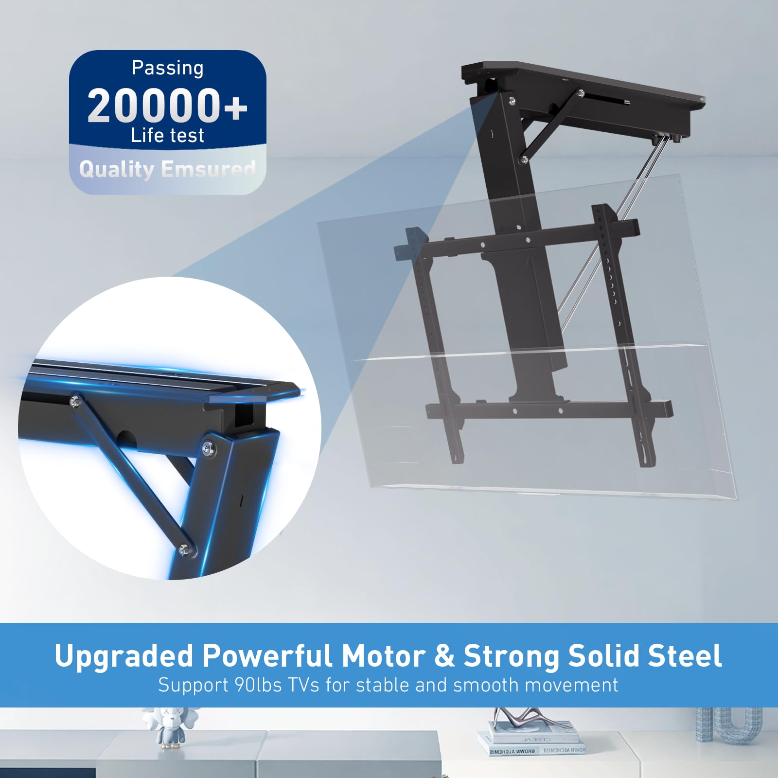 90 LBS Weight Capacity: The newly upgraded powerful motor and ultre-strong solid steel of the motorized ceiling tv mount flip down support 90lbs weight capacity and allow you to raise or lower the TV's position with ease. Never worry about our retractable tv mount sagging, drooping or falling. The tv ceiling mount flip down features a dual steel wire system that ensures slow, controlled unfolding to protect your wall from damage.