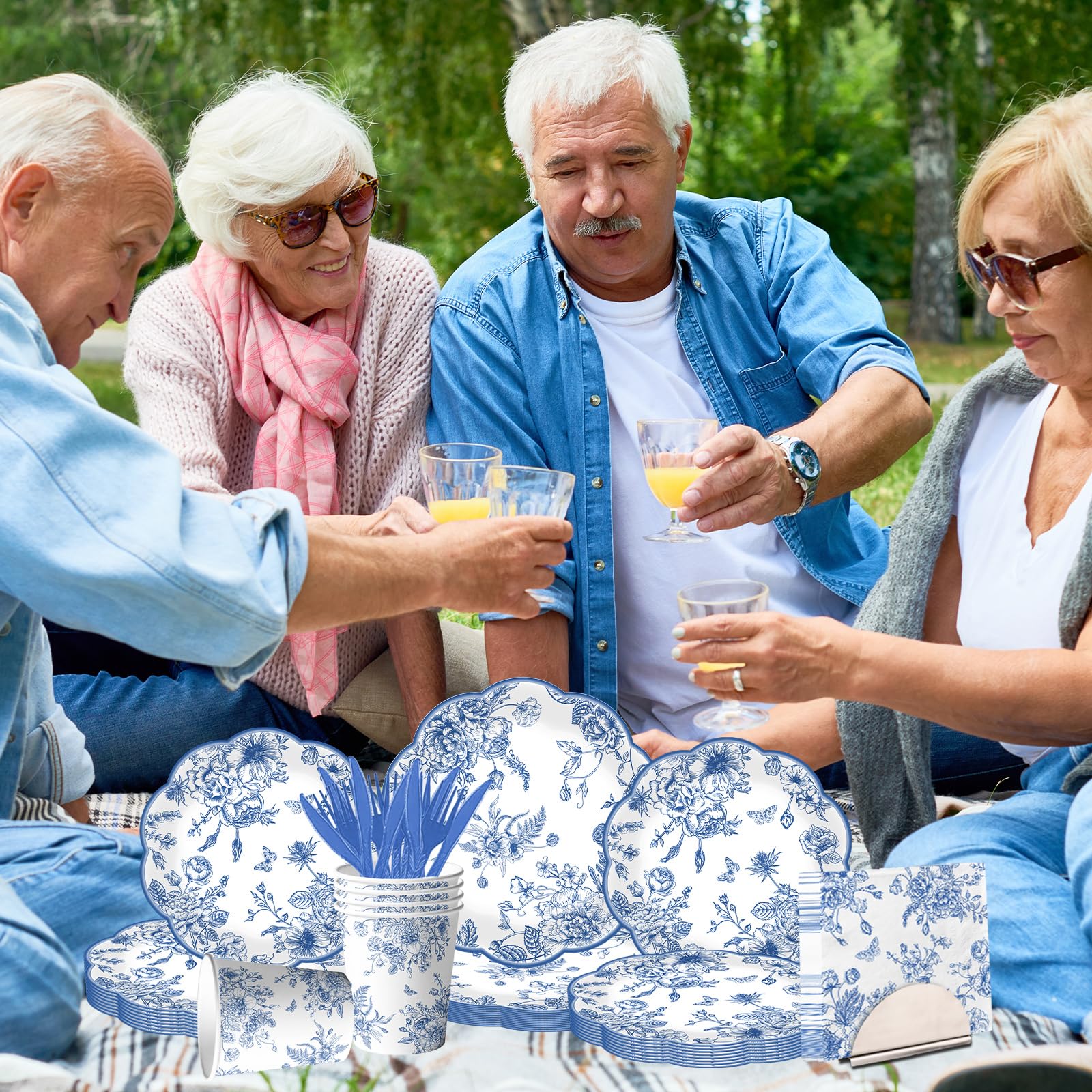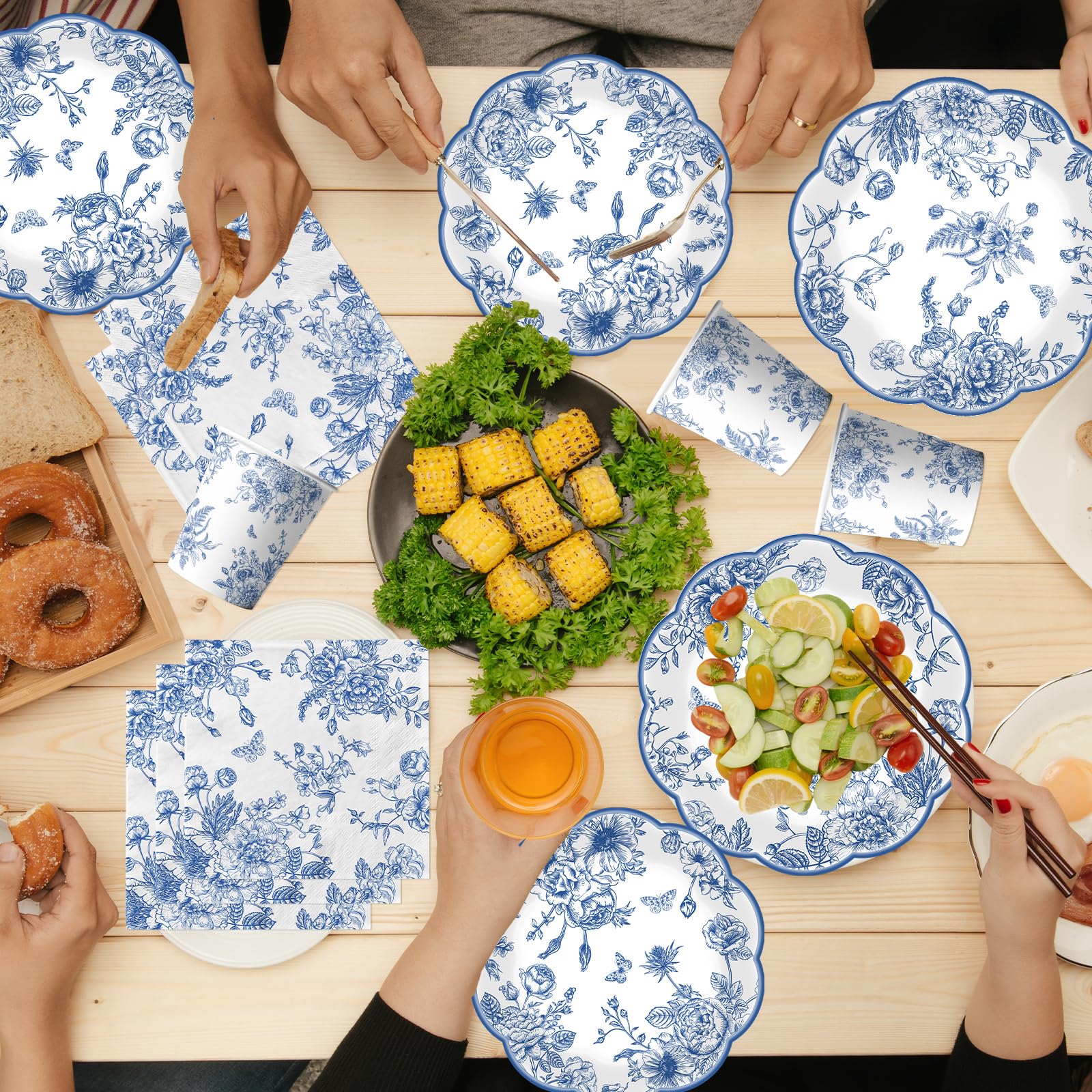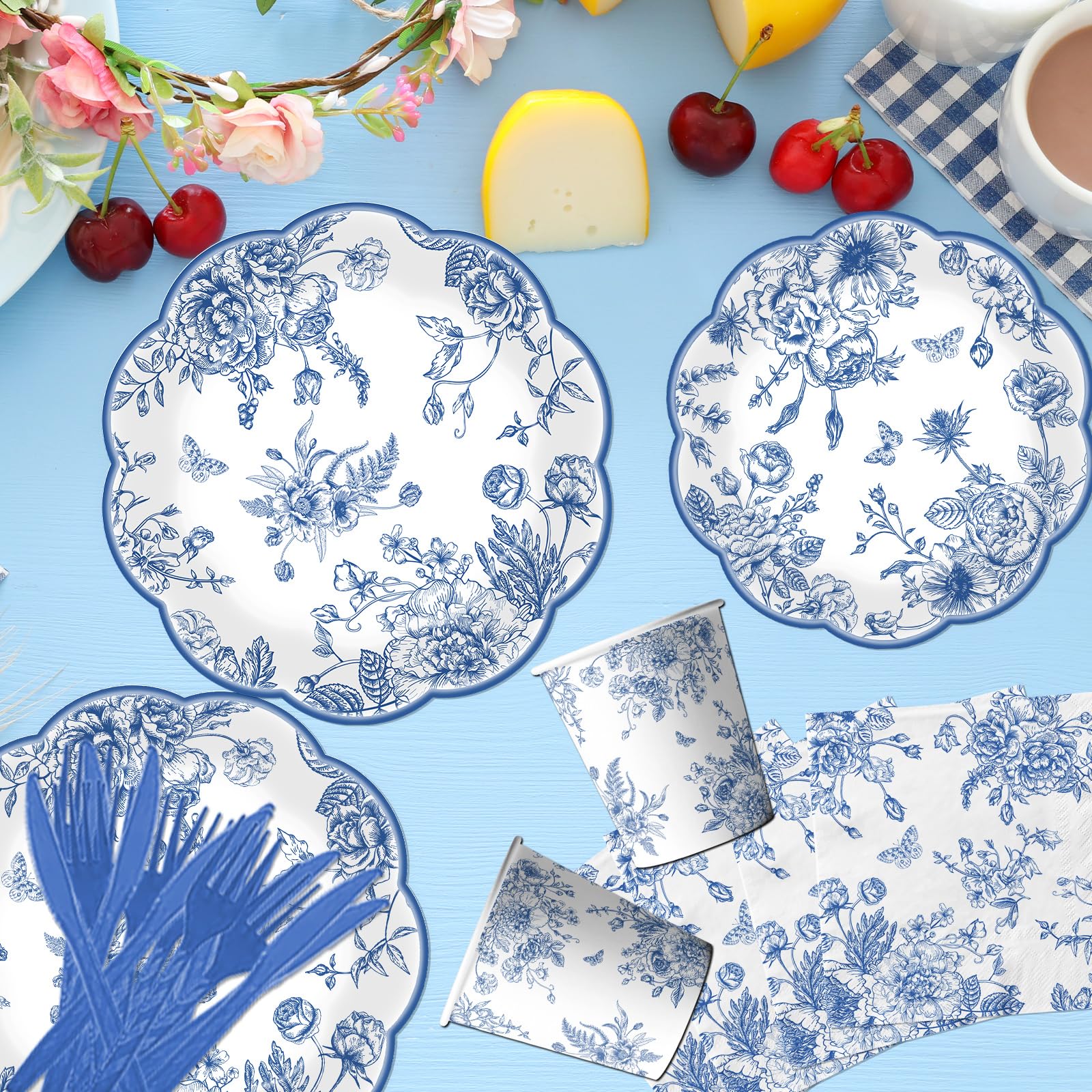 package includes: you will receive 124pcs blue floral dinnerware set includes 24pcs 9-inch scalloped blue floral plates, 24pcs 7-inch blue flower paper plates, 24pcs blue floral napkins, 24pcs blue knifves and fork each set can serve 24 guests. the vintage blue toile plates are ideal for creating a celebratory atmosphere and making your event memorable. this set of flower disposable plates and blue toile nakins set will add amazing to you, your family and friends