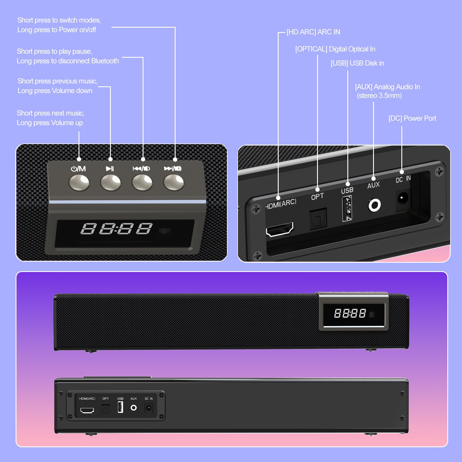 MULTIPLE CONNECTION OPTIONS FOR WIDE COMPATIBILITY – Supports HDMI ARC, Optical, 3.5mm AUX, USB, and Bluetooth 5.3 for flexible setup options. Compatible with a wide range of devices including TVs, projectors, desktops, laptops, tablet PCs, and mobile phones for convenient everyday use.