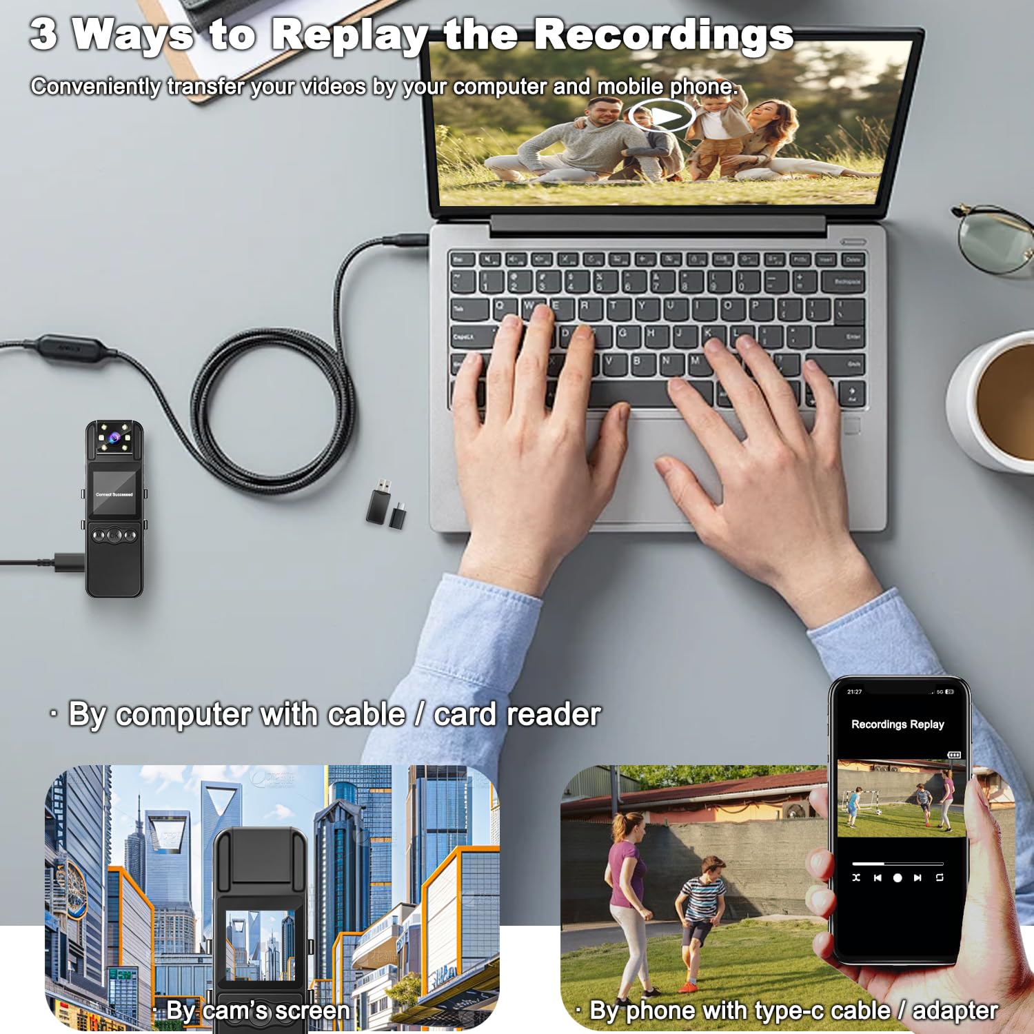 【6 HR Battery life/64GB & 3 ways to Replay】The Body Camera with Equipped with a 1600mAh rechargeable battery, that can last almost 6-7 HR working time, also supports 24/7 recording video when connecting the power bank/power, helps you keep an eye on everywhere. ①Our body cameras have a built-in 64GB card, to support your long-time recording saving and are recognized by cellphones/laptops/PC to replay.②Replay on screen.