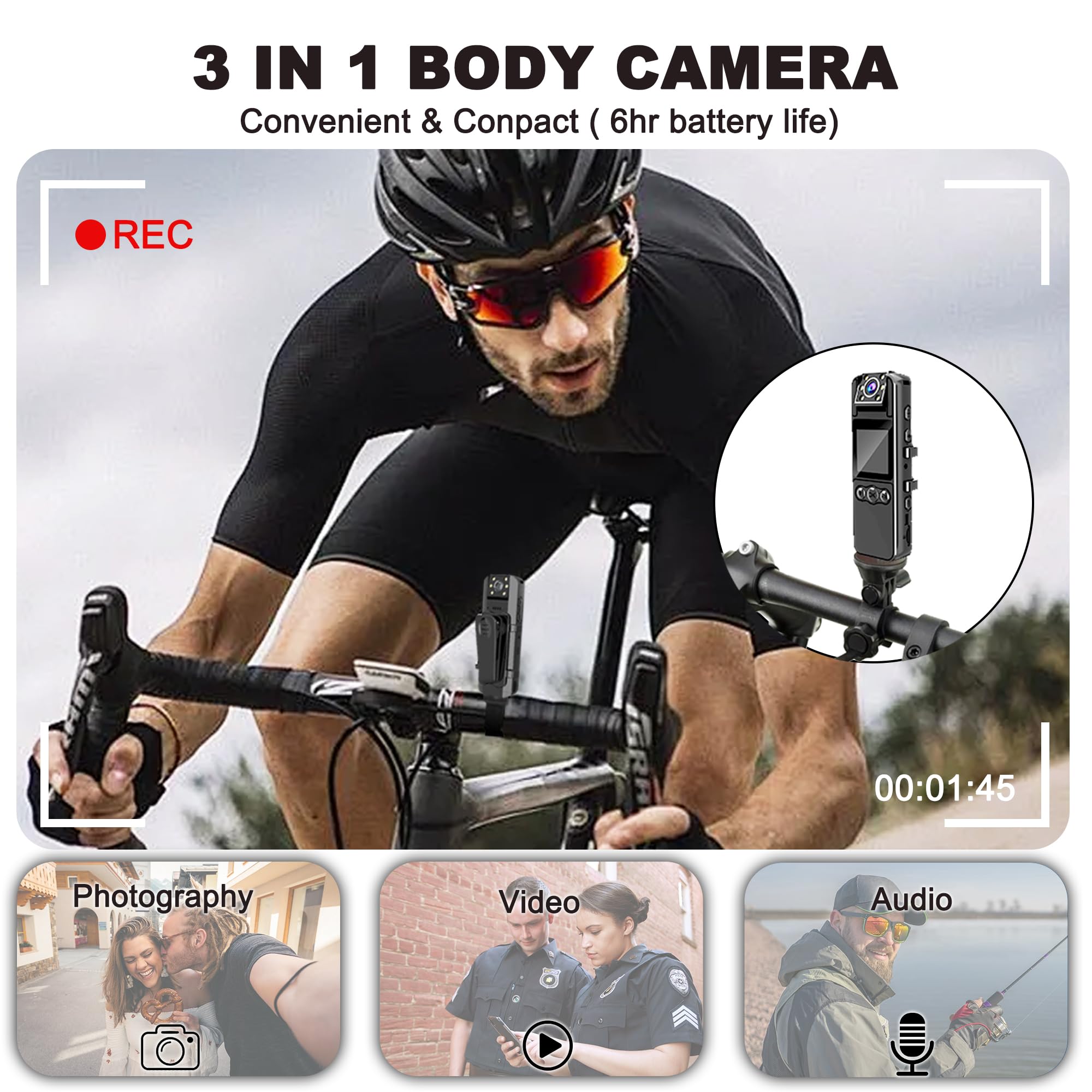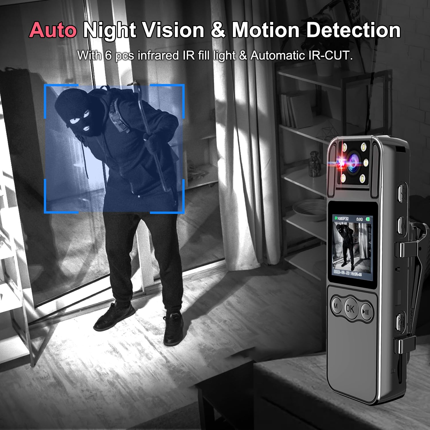 【180° Rotatable - 120° lens & Motion Detection / Auto Night Vision】 Body camera with a 180° rotatable /120° lens that can adjust the lens direction to your demand, ensuring the cam will not record at a wrong angle, miss the important evidence. Motion detection can help you save more power and memory space when you don't need to record all the time. The camera will auto-turn into night vision by the bodycam's 6 pcs IR lens to record when you under a dark environment, ensuring your night record.