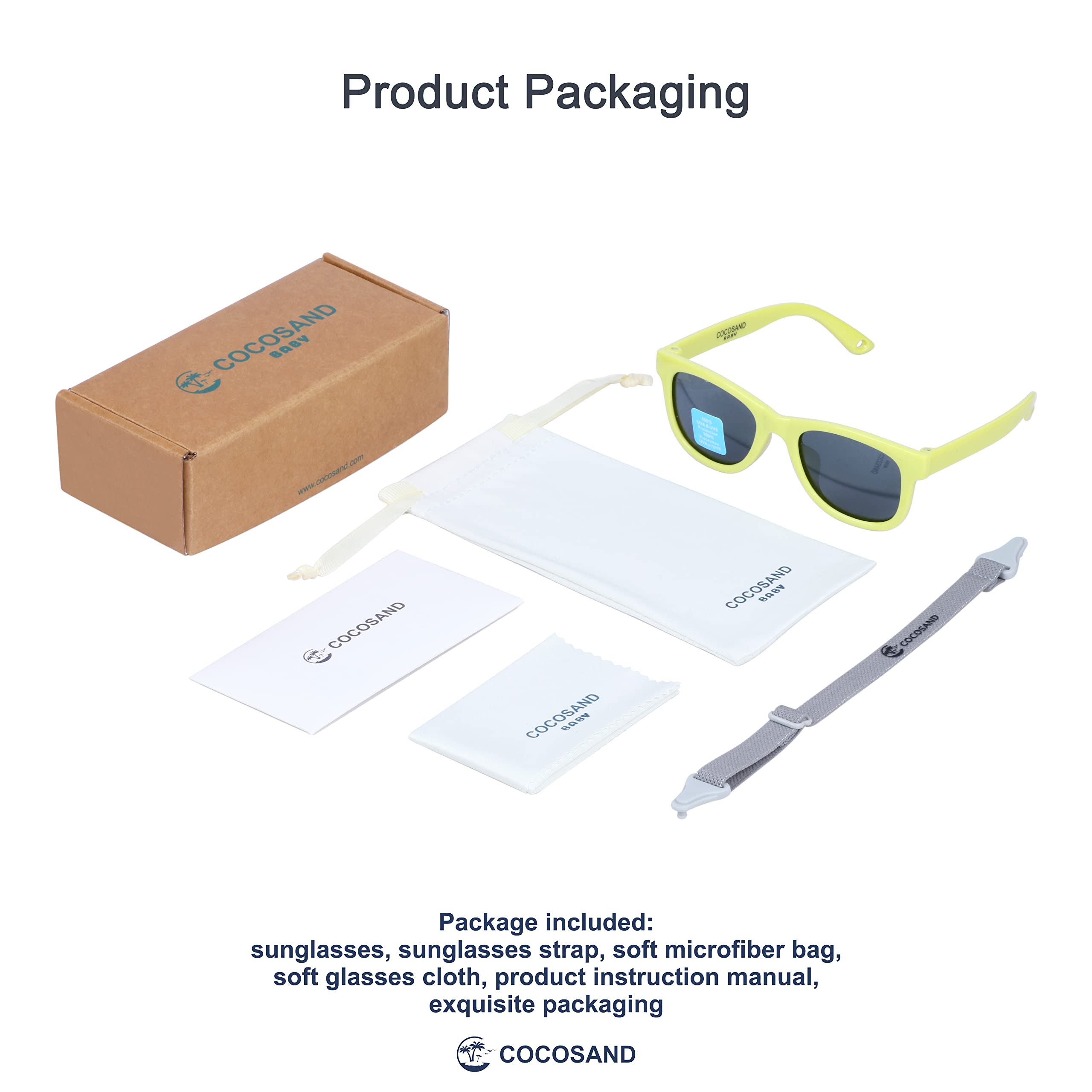 Package Includes: 1 pair of sunglasses, 1 adjustable strap, 1 glasses pouch, 1 cleaning cloth, an instruction manual, and a sunglasses storage box. Sunglasses, accessories and packaging are all recyclable. Advocate the creation of a better ecological environment and refuse to overdraw the earth's resources
