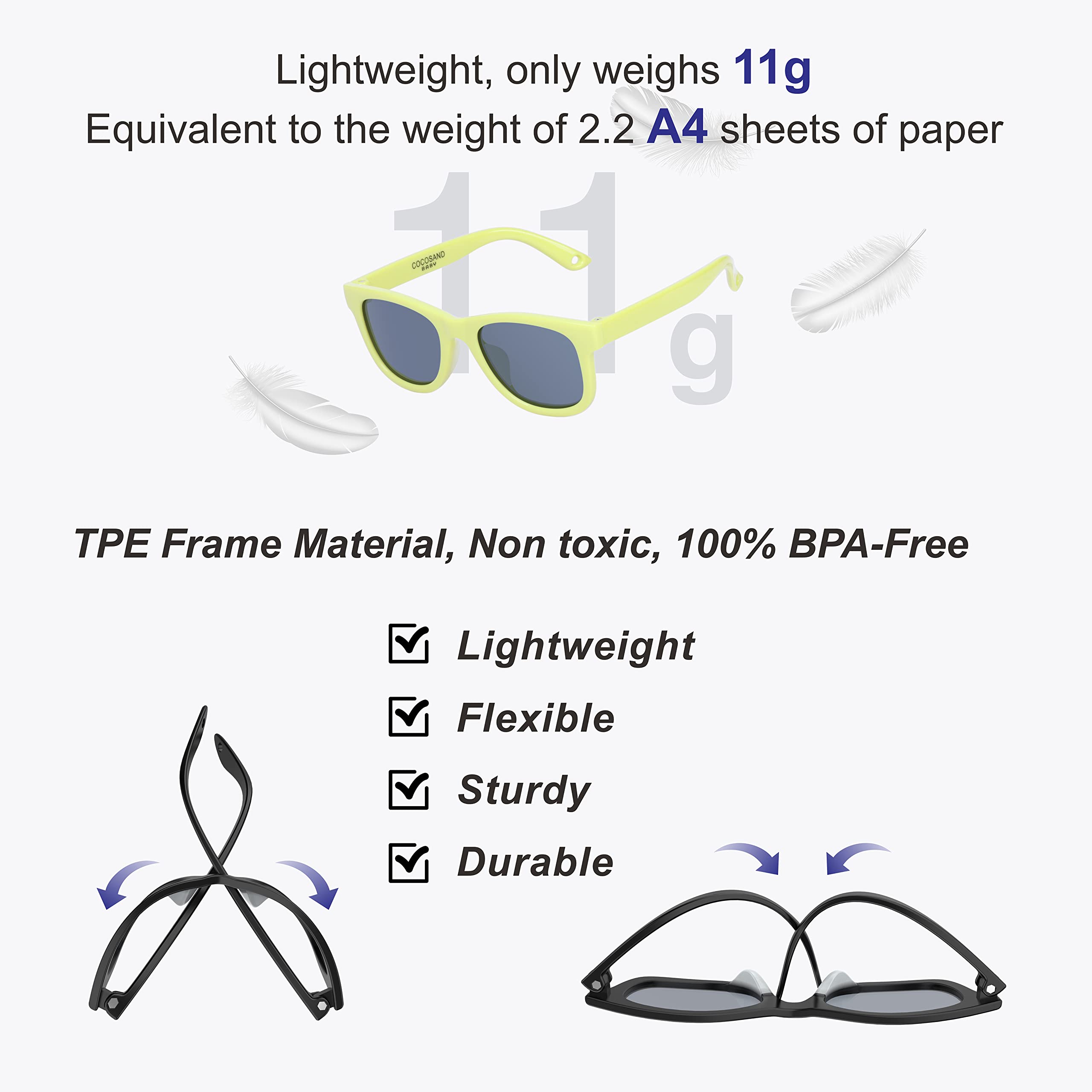 Lens: Polarized lenses. Blocks UVA, UVB and harmful blue ray. HD vision, Glare Free. Wearing it in outdoor activities can reduce eye fatigue, reduce the damage caused by sunlight to baby's eyes