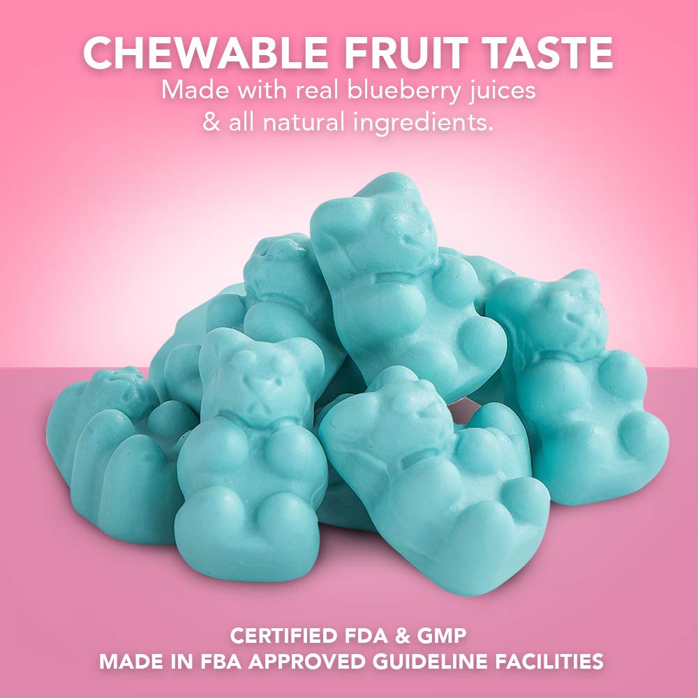 60 Chewable Fruit Taste | Easy to chew blue bear gummies for adults & kids. Made with real blue berry juices and all-natural ingredients. Our hair gummies are vegan, kosher, halal, non-GMO, gluten-free & dairy-free. A tasty alternative to pills, capsules, tablets, oils, drops & liquids