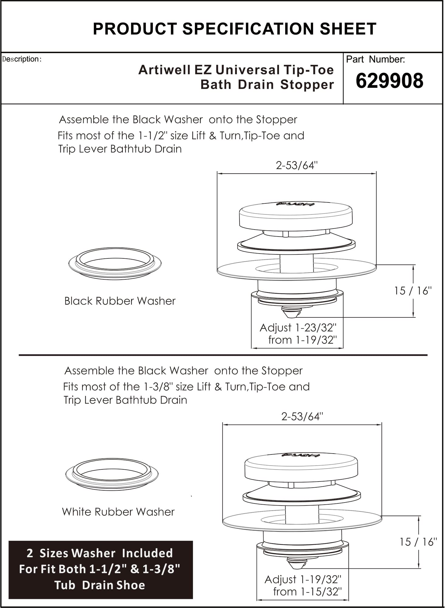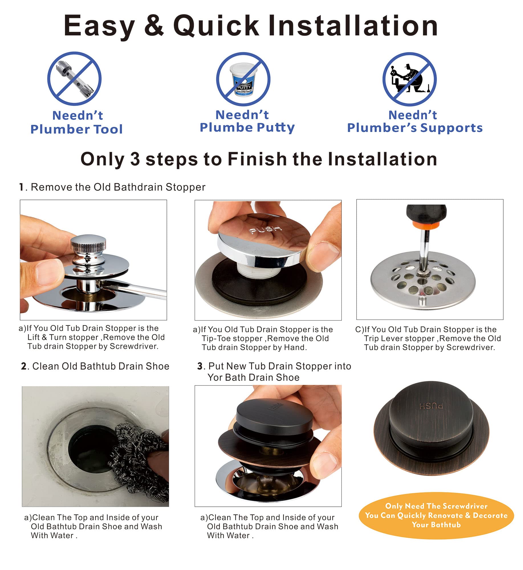 COMPATIBILITY: Artiwell Universal Tough-Toe Bath Drain Stopper and Cover have been tested by the plumber, which can be replaced 99% lift and turn, Tip Toe and trip lever Bathtub drains, Includes 2 types of o-rings for you to choose from to fit your existing 1-3/8” or 1-1/2” tub drains.