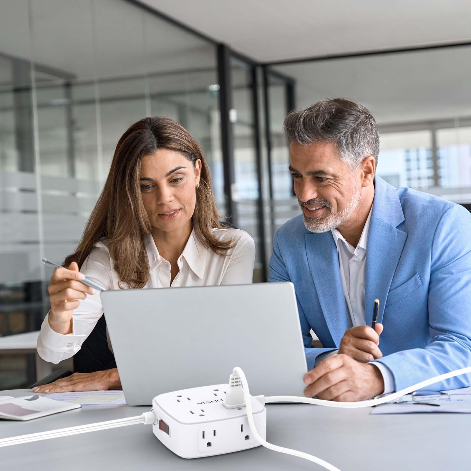 【Surge Protector Power Strip with 3 Side Design & Wide Space】- 3-side design that makes it easier to make the plugs not covering any outlet, and the 8 AC outlets with 1.8 inches long space in between, larger than standard 1.5-inch socket. Larger spacing makes it easier to use for all kinds of equipment.The compact design saves more space, suitable for the home, office, and college dorm room.