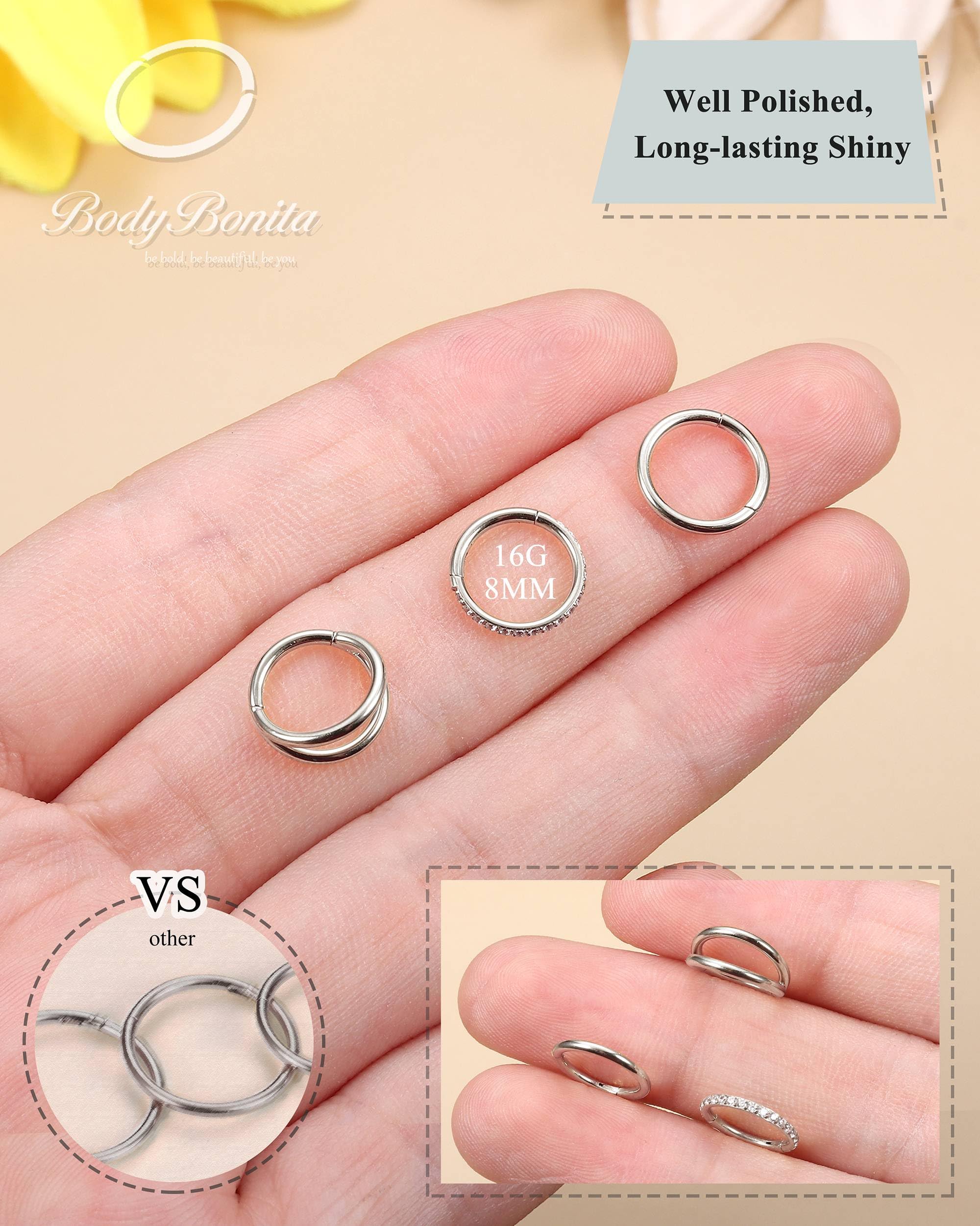 Seamless Nose Ring Hoop: Gauge size: 16G(1.2mm); Inner diameter: 8mm(0.31 inches); Material: 316L stainless steel; One order includes 3 pieces of hinged segment ring, come in various styles to meet your fashion needs: sparkly CZ nose hoop, double hoop nose ring, dainty single septum hoop; We've provided the size comparison chart for your reference