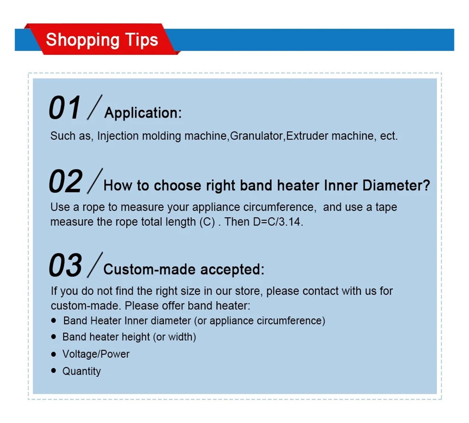 Specification:Product Name: CeramicBandHeatersVoltage: 110V/220V/380VPower: 300WTube Size: 36x40mm (IDxL)Material: Aluminium Plate,CeramicPower Tolerance: 10%Package: 1PC x Cartridge Heater