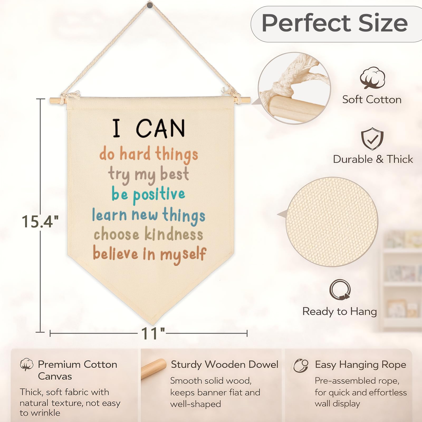 Empower the next generation with our "I Can Do Hard Things" Canvas Hanging Flag. Measuring 15.5 x 11 inches, this artisan-crafted banner is a heartfelt tribute to the mentors and students who face challenges with courage. Featuring essential growth mindset affirmations like "Believe in Myself" and "Try My Best," it serves as a daily visual mentor in any classroom, library, or bedroom. Made from heavy-duty cotton canvas and supported by a solid wooden rod, this high-quality banner is a durable and beautiful gift that celebrates the power of persistence.