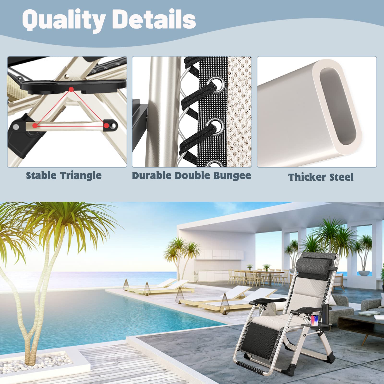 Removable Soft Pad: Intuitive design features that this outdoor zero gravity chair can be used by anybody. You can remove the soft cushion from the folding lounge chair to promote better airflow during hot summer days. Plus,the chaise lounge chair is very easy to install and can be easily folded, for easier storage and handling