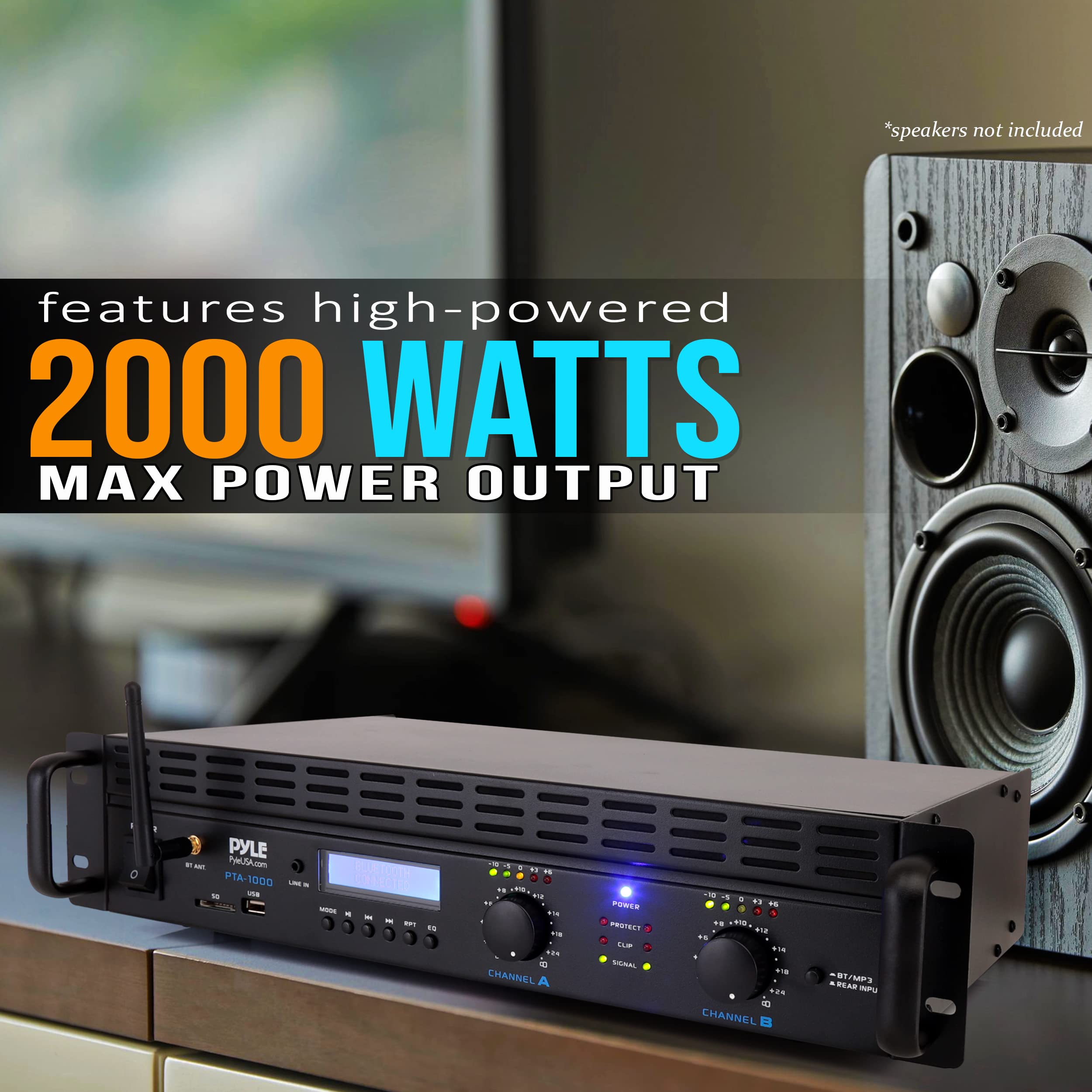 Features: - 2-Channel Pro Audio Amplifier - Bridge-able Amp: Bridge Mode Ability - Built-in Bluetooth Wireless Streaming - With LCD Displayer, can show ID3 format. - (2) 1/4'' TRS Input Connector Jacks - (2) XLR Input Connector Jacks - (3) SpeakOn Output Connectors (A/B/Bridged) - (2) Pair Speaker Terminal / Binding Post Connectors - Power, Protect, Clip, Signal LED Indicators - Left and Right Channel Level Signal Indicators - Built-in Ventilation Cooling Fans - Front Panel Control Center - Rack-Mountable System Bluetooth Connectivity: - Simple & Hassle-Free Pairing - Instant Wireless Audio Streaming Ability - Works with All of Today’s Latest Bluetooth Devices - (iPhone, Android, Smartphone, iPad Tablet PC etc.) - Bluetooth Network Name: ‘PYLE PRO” - Bluetooth Version: 5.0 - Wireless Range: Up to 30’+ ft. What's in the Box: - Pro Audio Amplifier - Power Cable - BT & FM Antenna Technical Specs: - Power Output: 2000 Watt MAX - Amplifier Type: 2-Channel - 2 x 1000 Watt @ 4 Ohm - 2 x 500 Watt @ 8 Ohm - Distortion: <1.0% - Input Level: +4dB - Signal/Noise Ratio: 102dB - Frequency Response: 20Hz - 20kHz, +/-0.2dB - Power Supply: 120/220V, Switchable - Product Dimensions (L x W x H): 19.09'' x 9.84'' x 3.54'' -inches