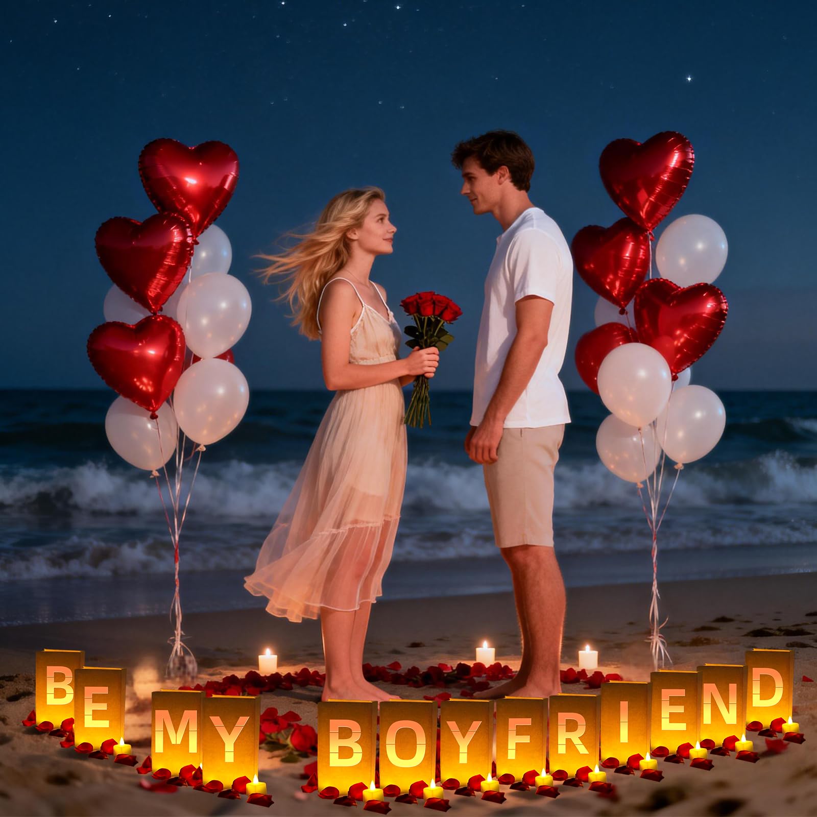 Surprise Decoration: Make your confession truly unforgettable by incorporating these eye-catching "Be My Boyfriend" light-up letters. The combination of LED tea lights with other decorative elements will elevate the atmosphere, surprising and delighting your loved one and leaving a lasting impression.