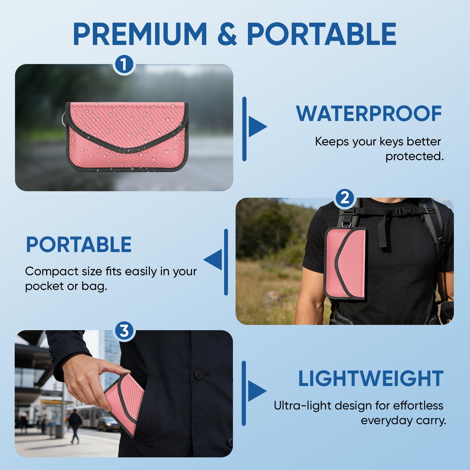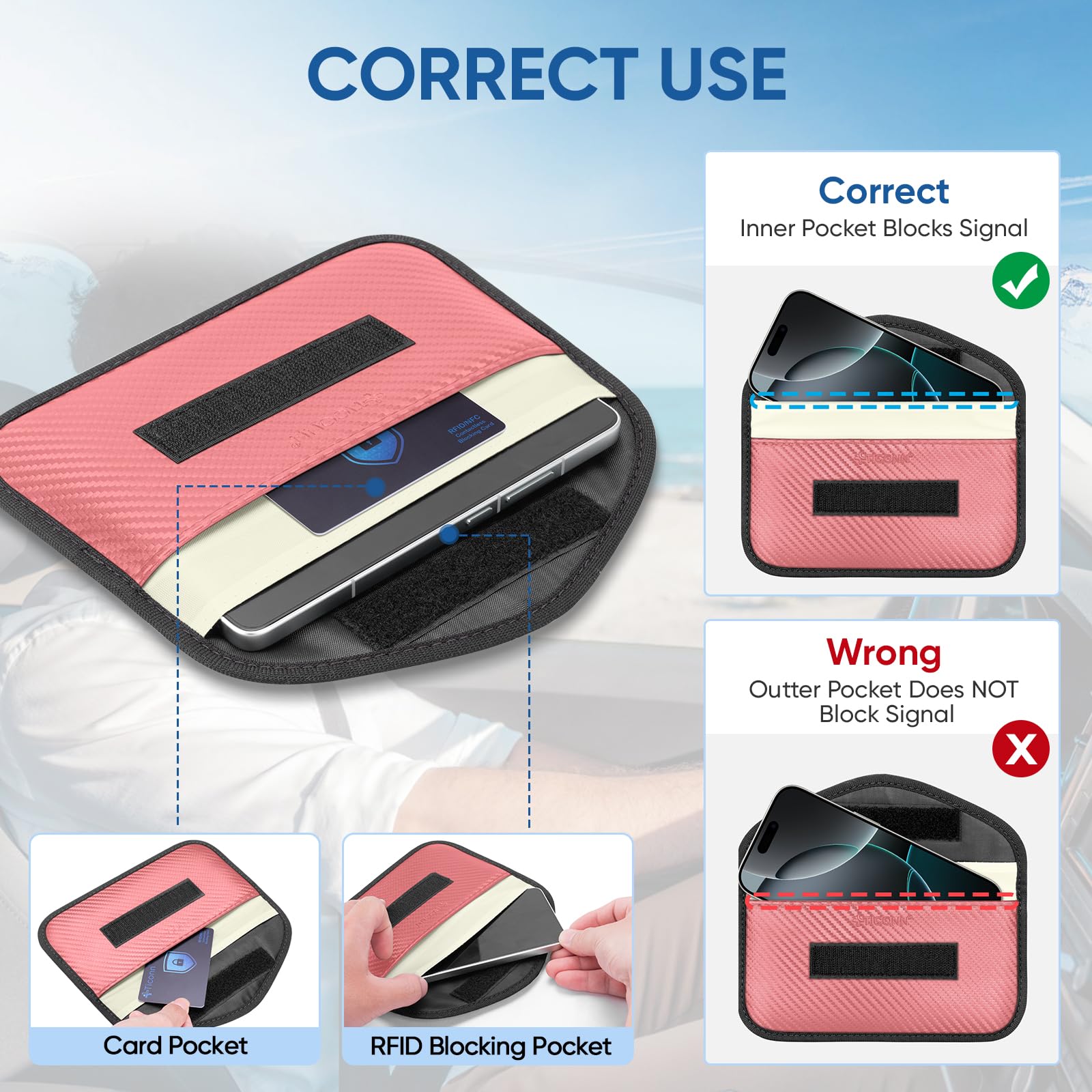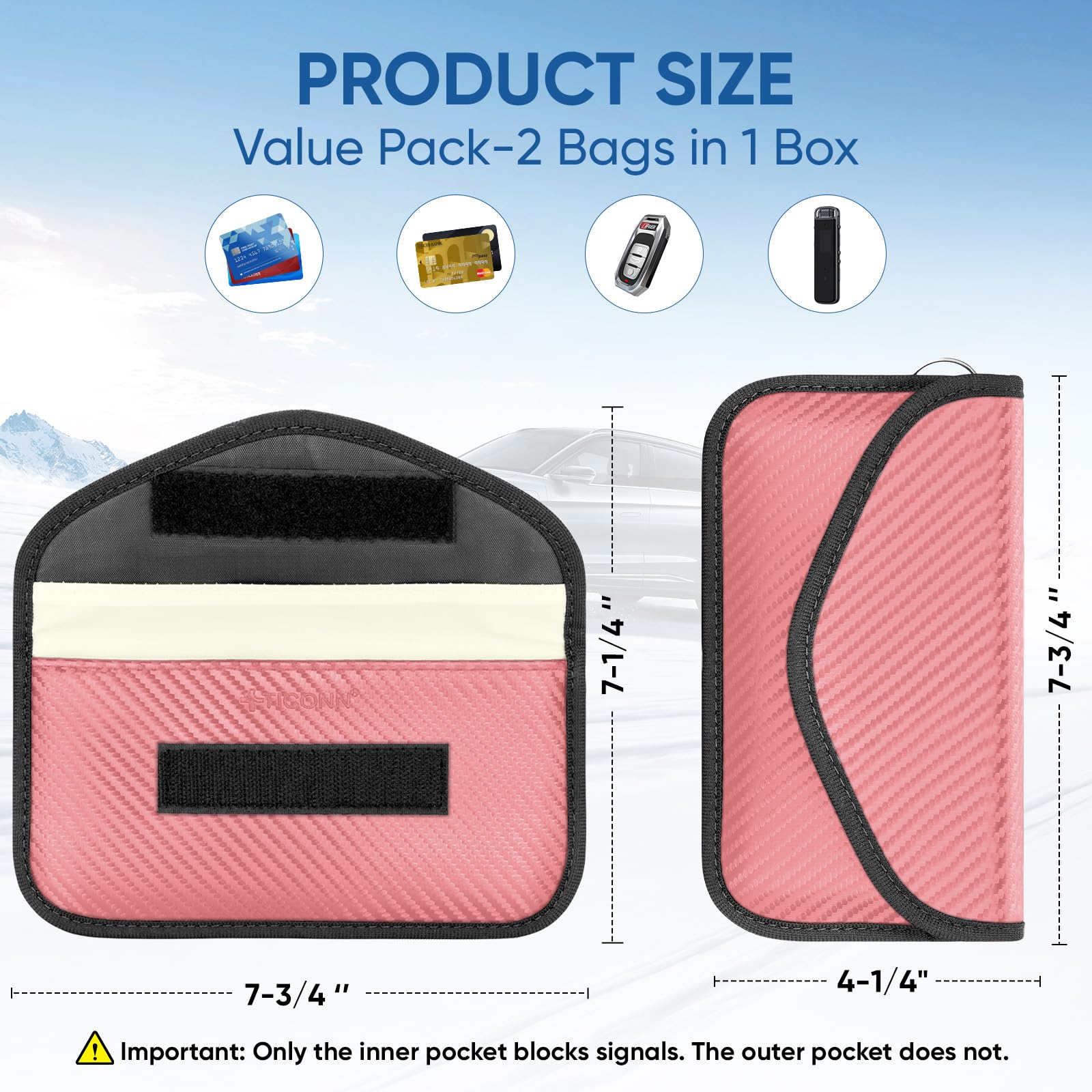 Convenience: The smaller/front pocket is anti-radiation, best for storing ID card, bank cards, etc; The larger/back pocket is for signal blocking, best for storing car key fobs