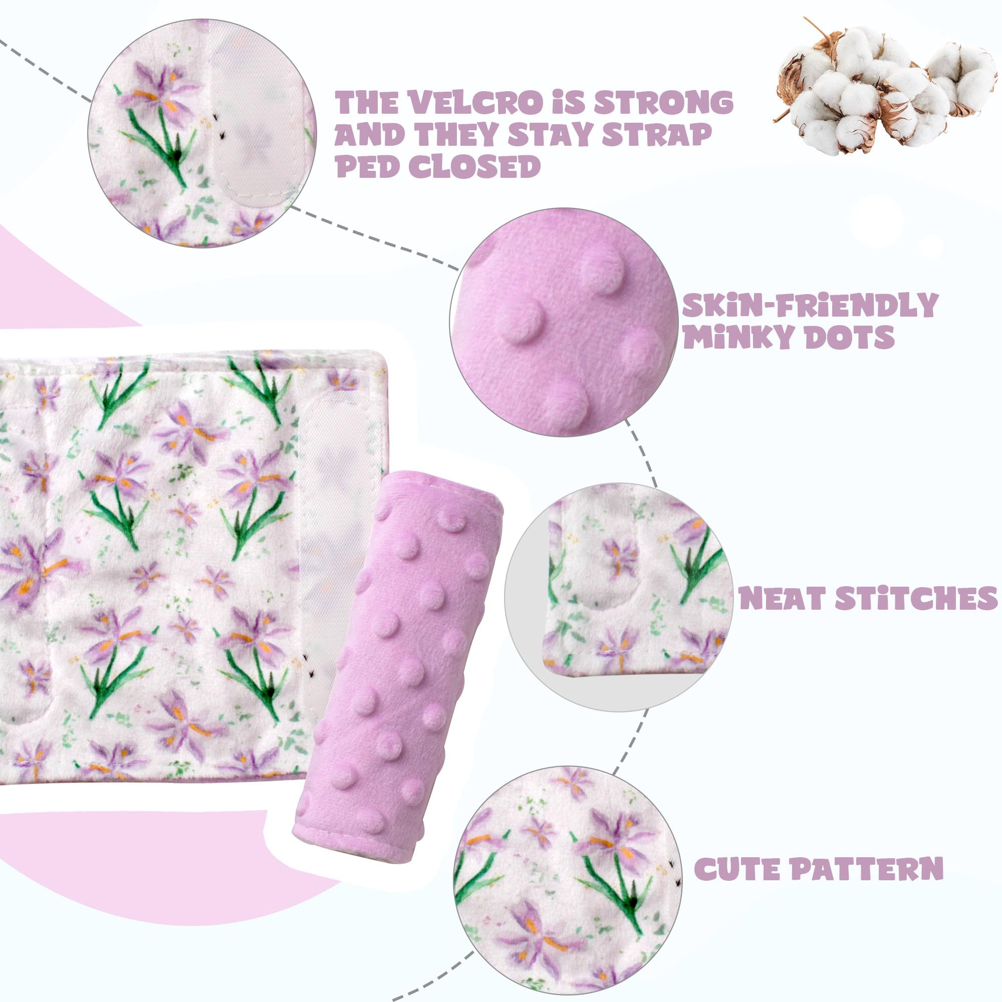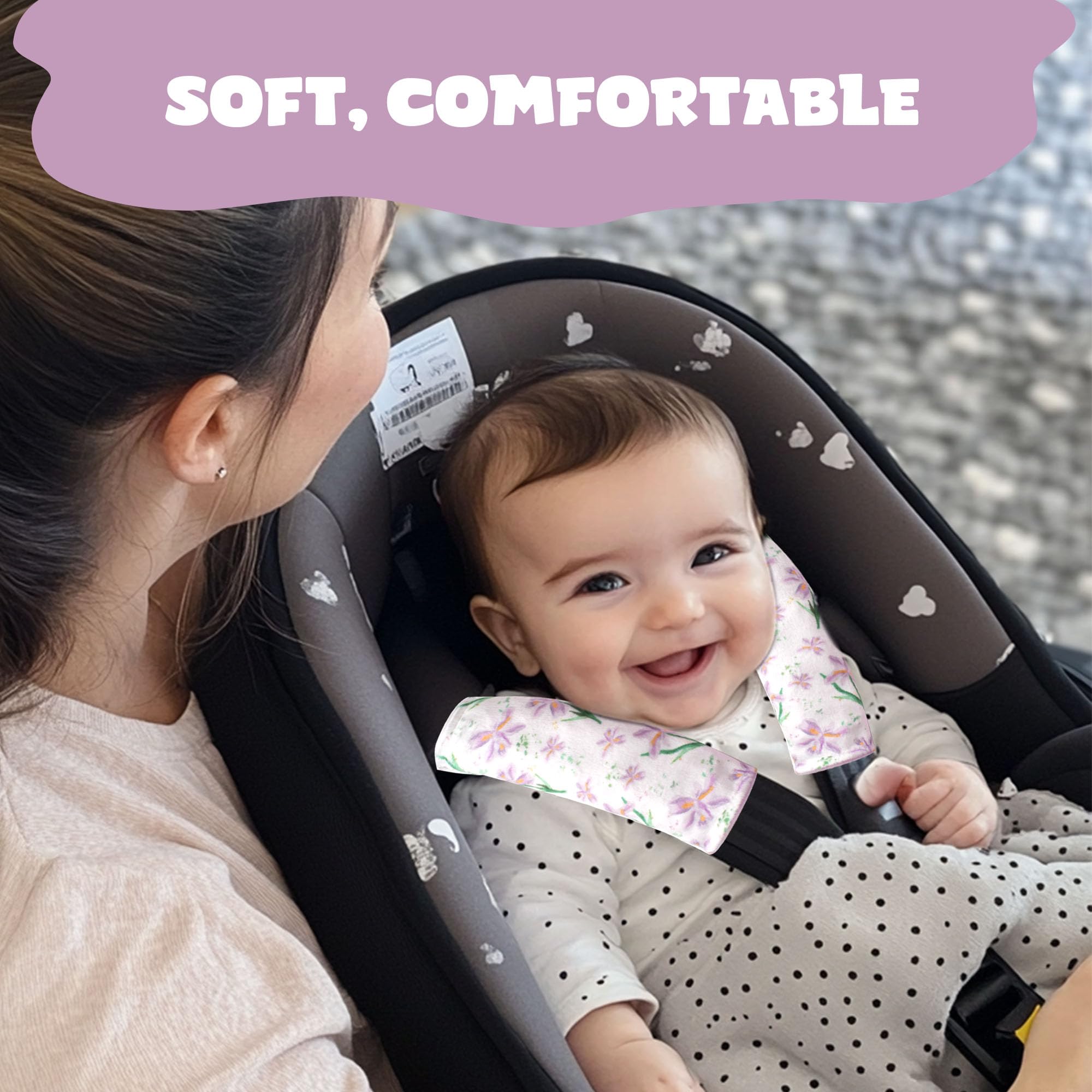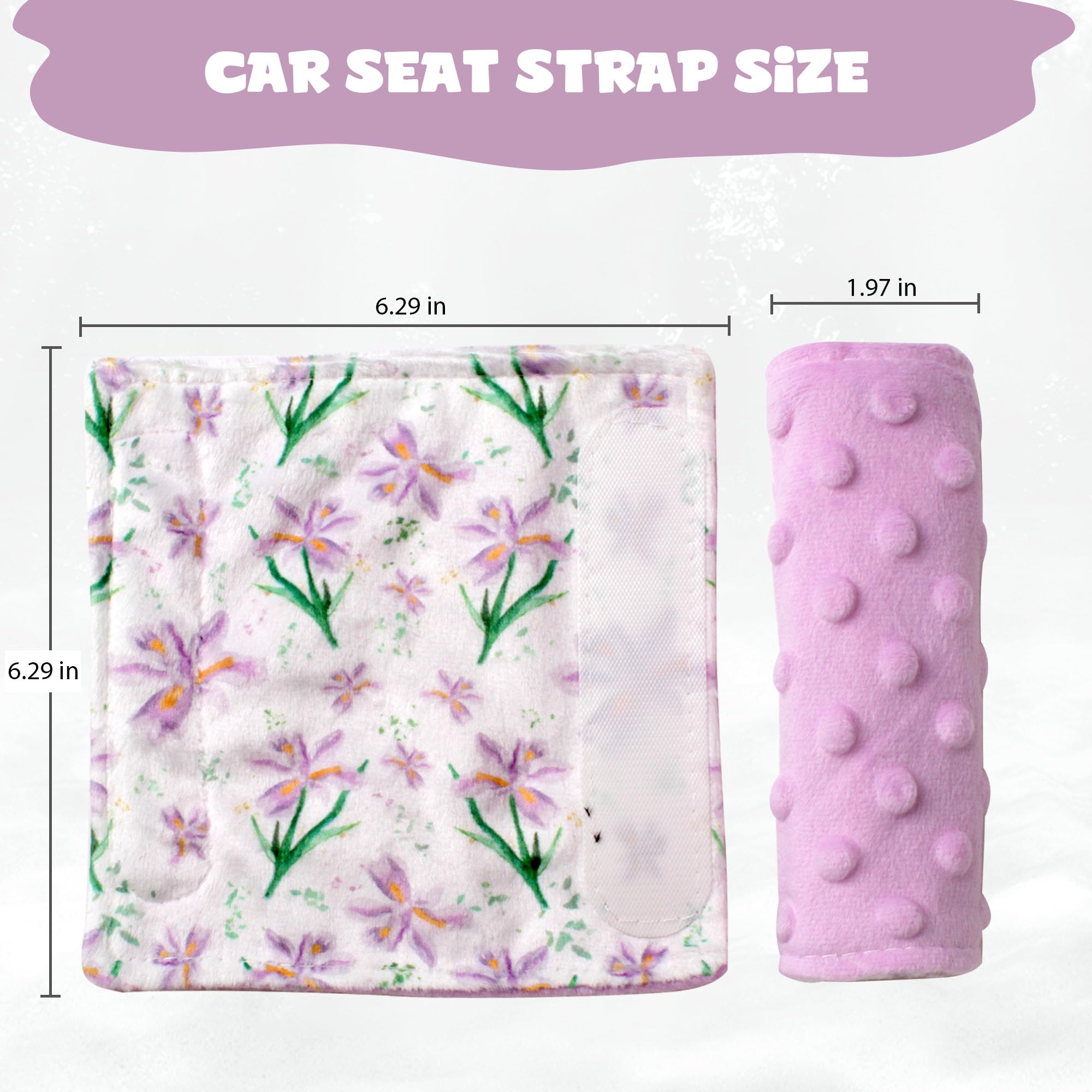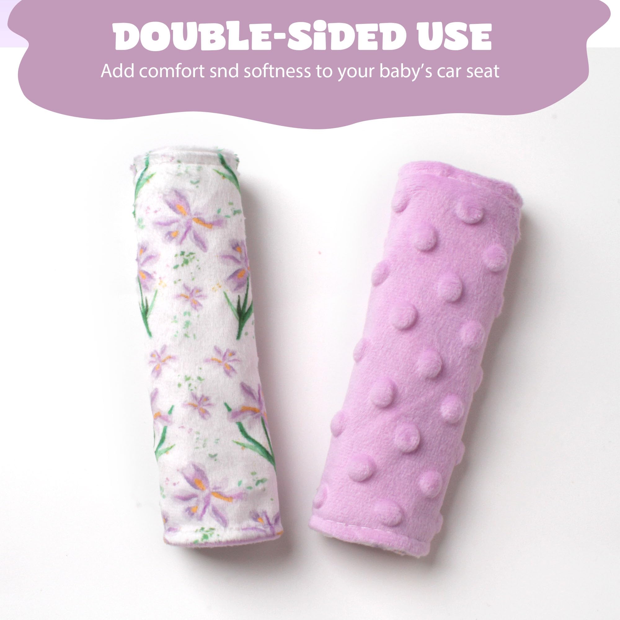 Soft and Cushiony: - Super soft on both sides of the car seat strap covers. Soft, pretty velvet on one side and minky dots on the other side! Added comfort snd softness to the car seat. No more red cut marks from seat belts!