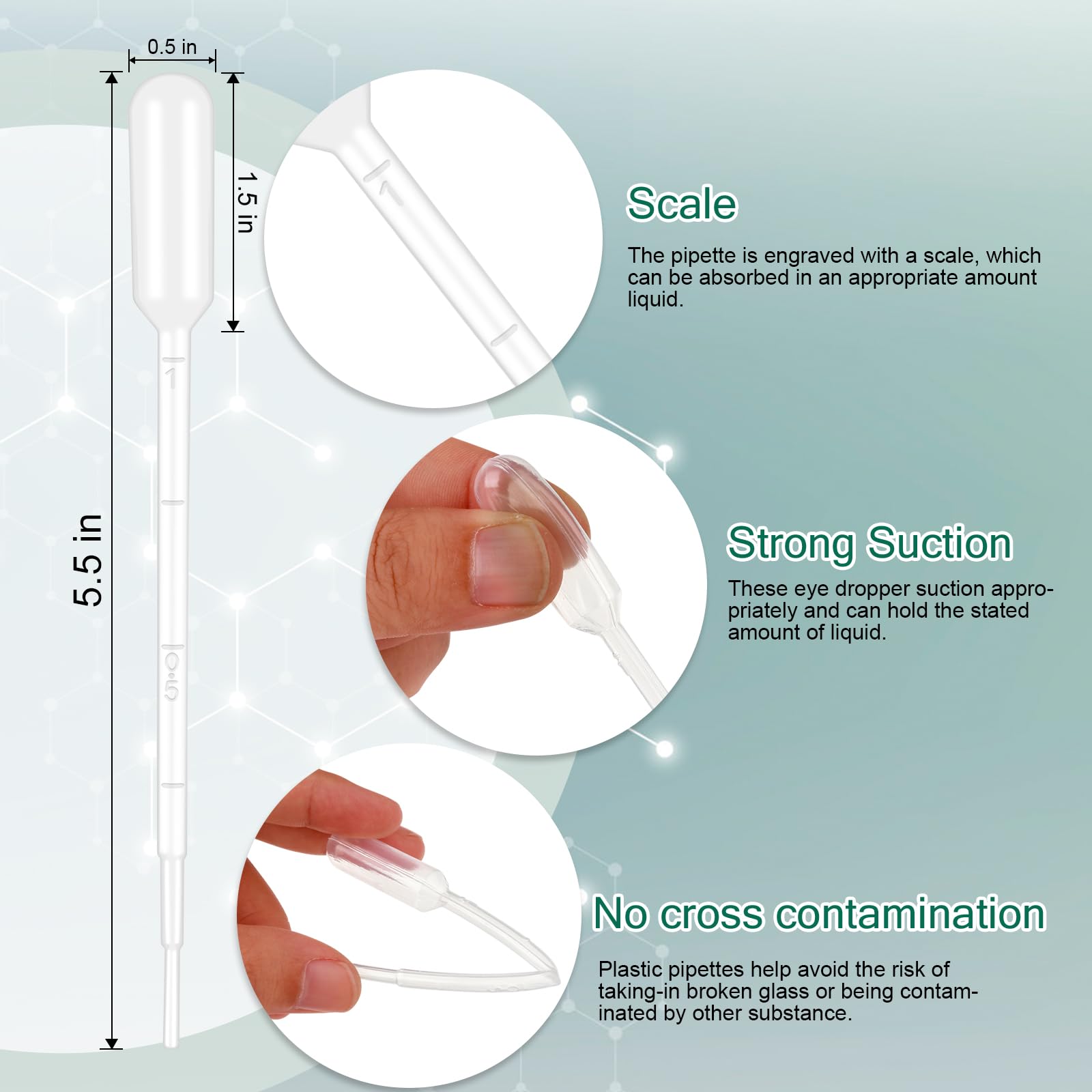 EASY TO USE and DISPOSABLE: These plastic pipettes are disposable and convenient for what you make. The humanized design reduces the trouble of cleaning and reduces the risk of cross-influence between solutions.