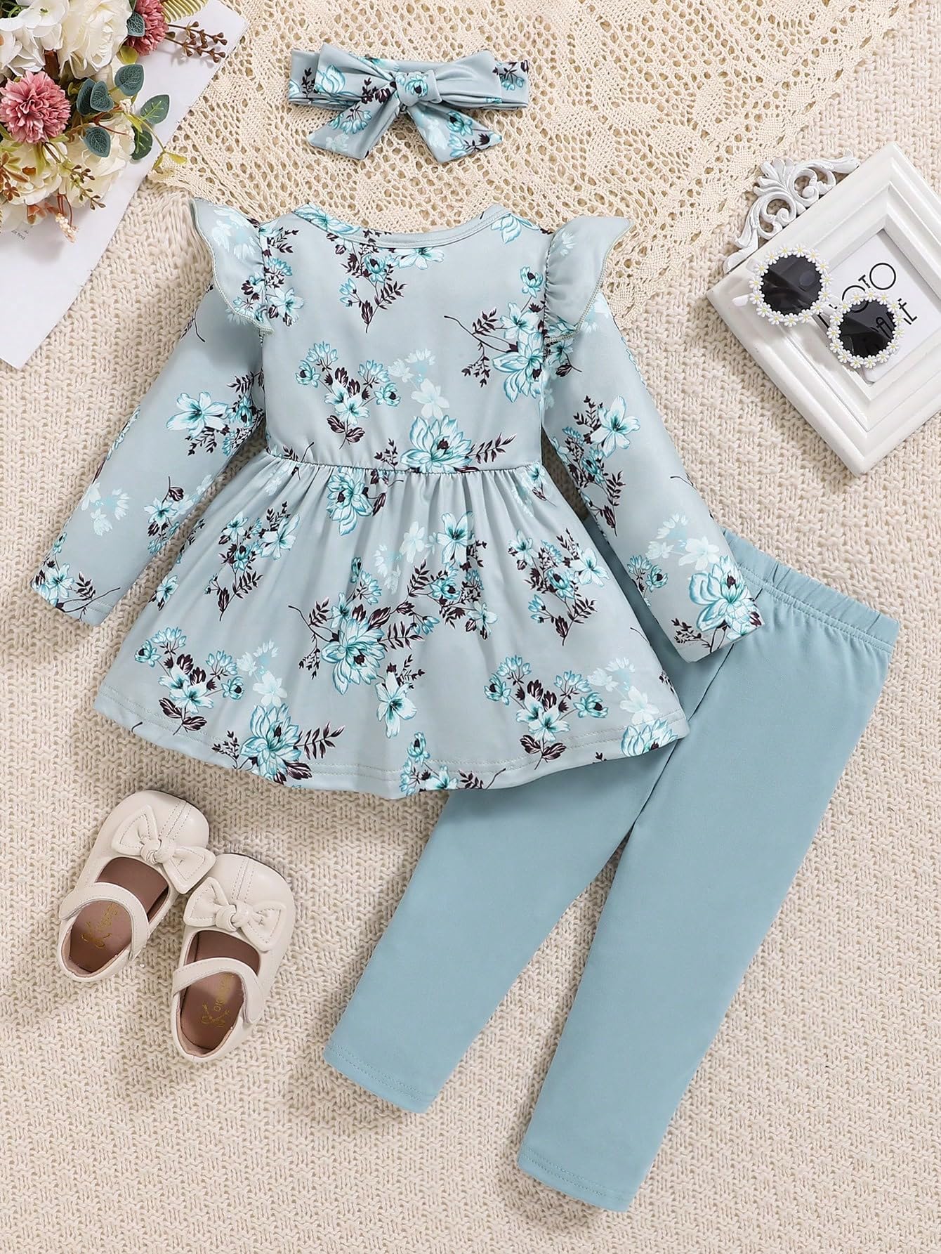 🎁Great-Gift Set for Toddler Girl :Packed 3-piece set (cute shirt+ soft pants + floral headband) in packaging. Makes birthdays or holidays effortless.