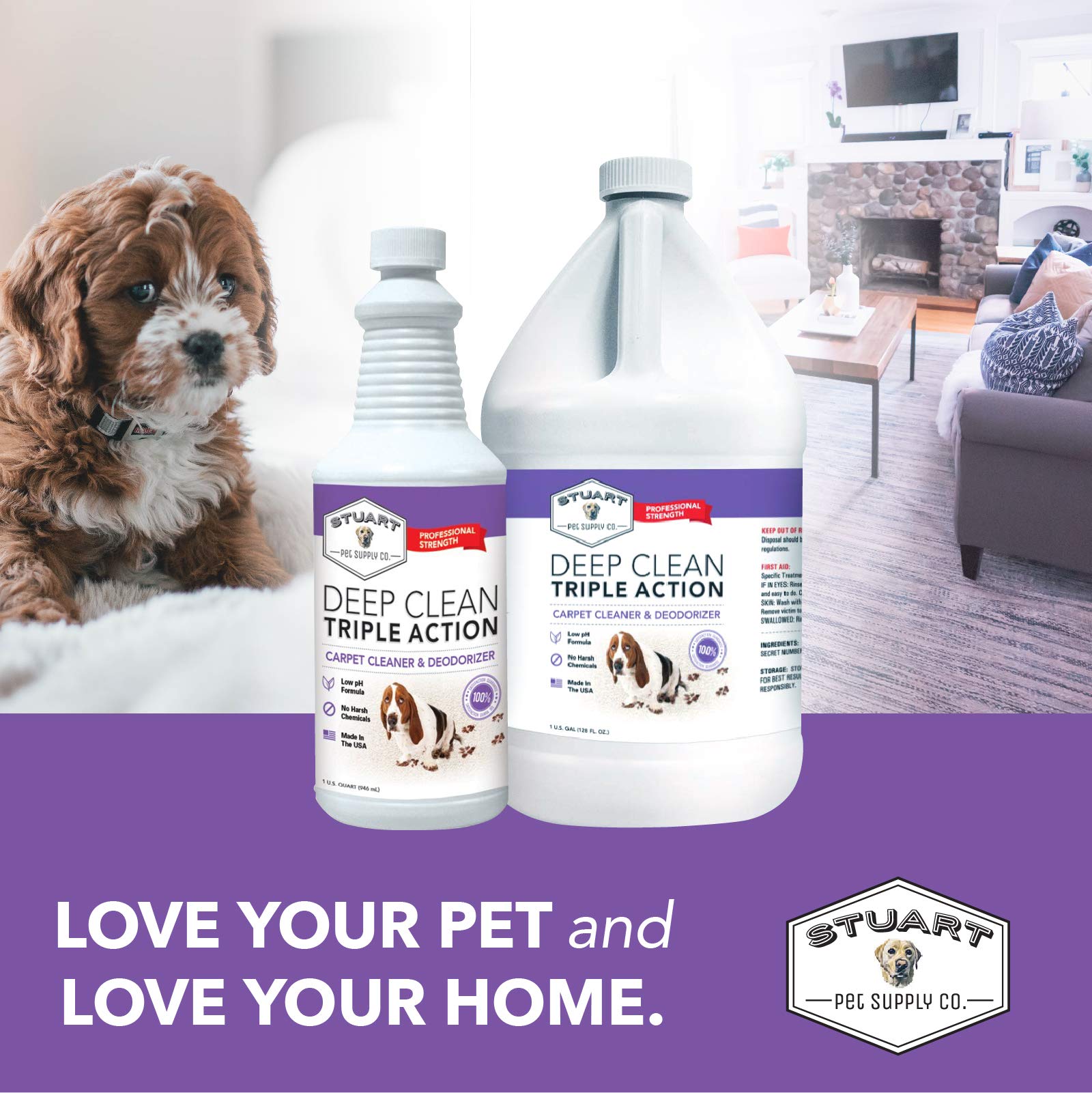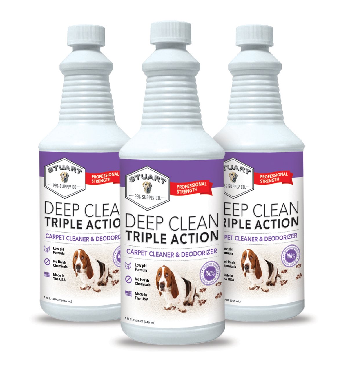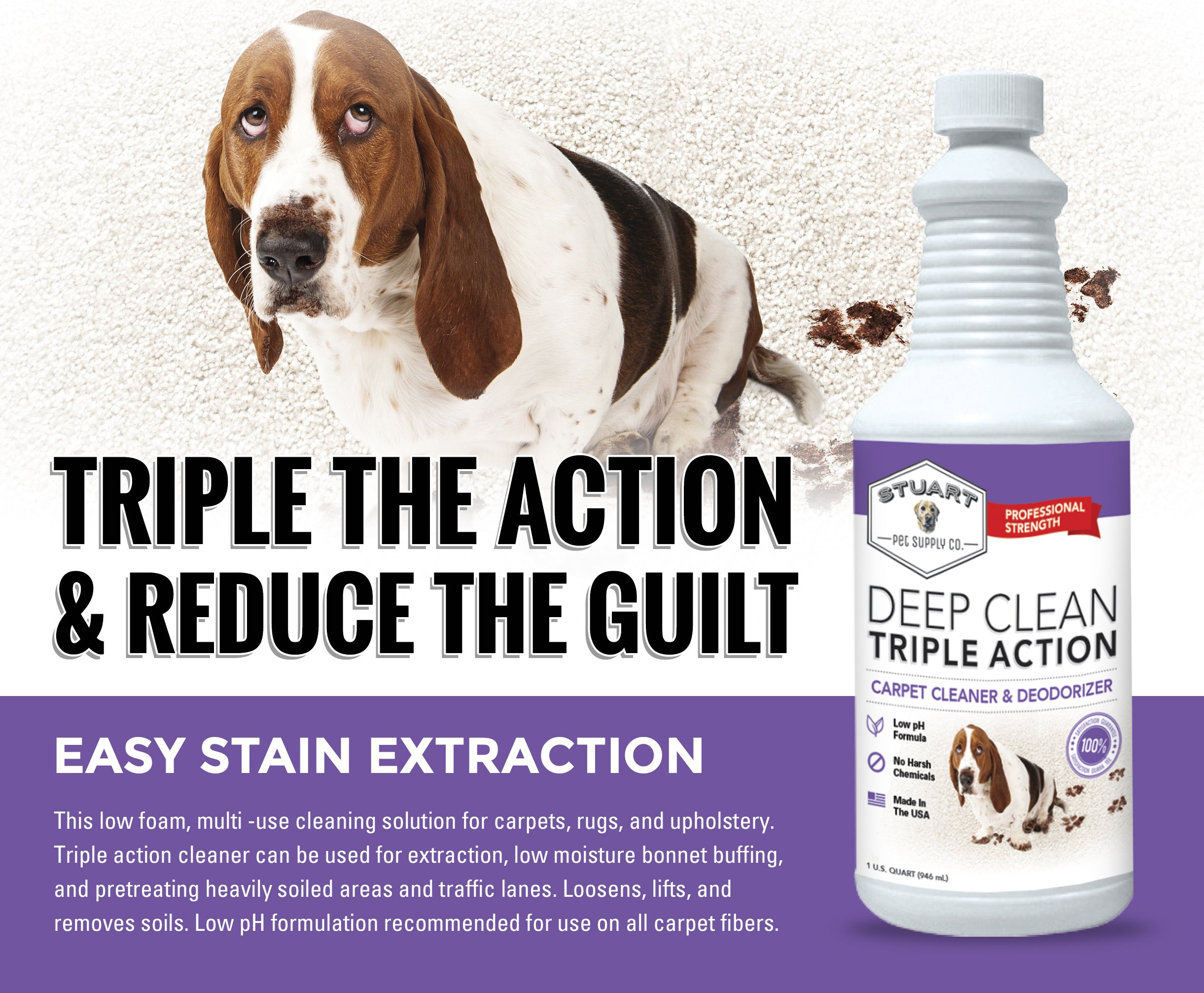 Stuart Pet Supply Co. advanced formulation with the latest greatest chemistry/technology in carpet cleaning. Low foam extraction cleaner. Use on carpets, rugs and upholstery. Cleans, deodorizes and brightens. Low pH formula recommended for use on all carpet fibers. Dries to an encapsulating crystalline powder. No sticky residue left behind. Deep Clean 3X performs miracles on dirty carpets by making them look, smell and feel brand new. This advanced formula is specifically designed to be used with all water-based carpet cleaning machines and carpet steam cleaners. Deep Clean-Triple Action is a proven tool as carpet cleaner solution for all dirty carpets leaving them fresh, soft and back to new looking. Simply the best carpet shampoo and rug shampoo available.