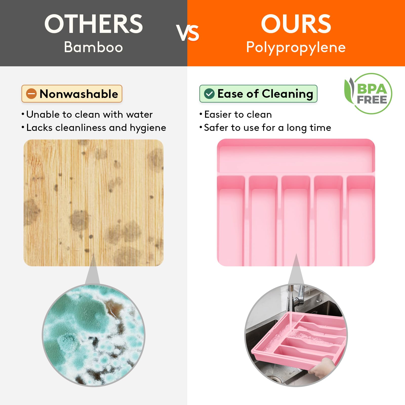Robust and Safe: This kitchen drawer organizer is crafted from premium PP material, BPA-free and built to last. It ensures your silverware is stored in a healthy, safe environment for worry-free use