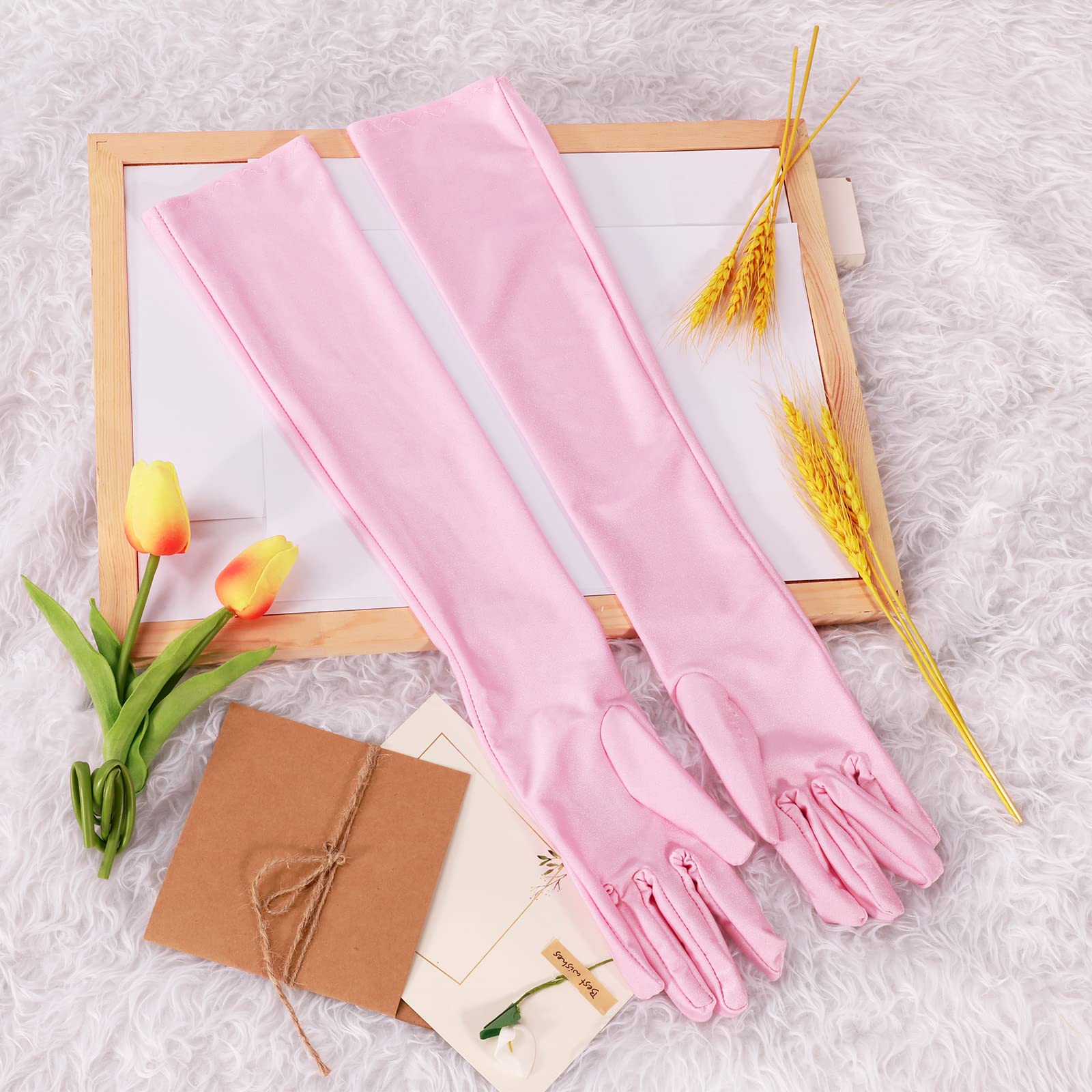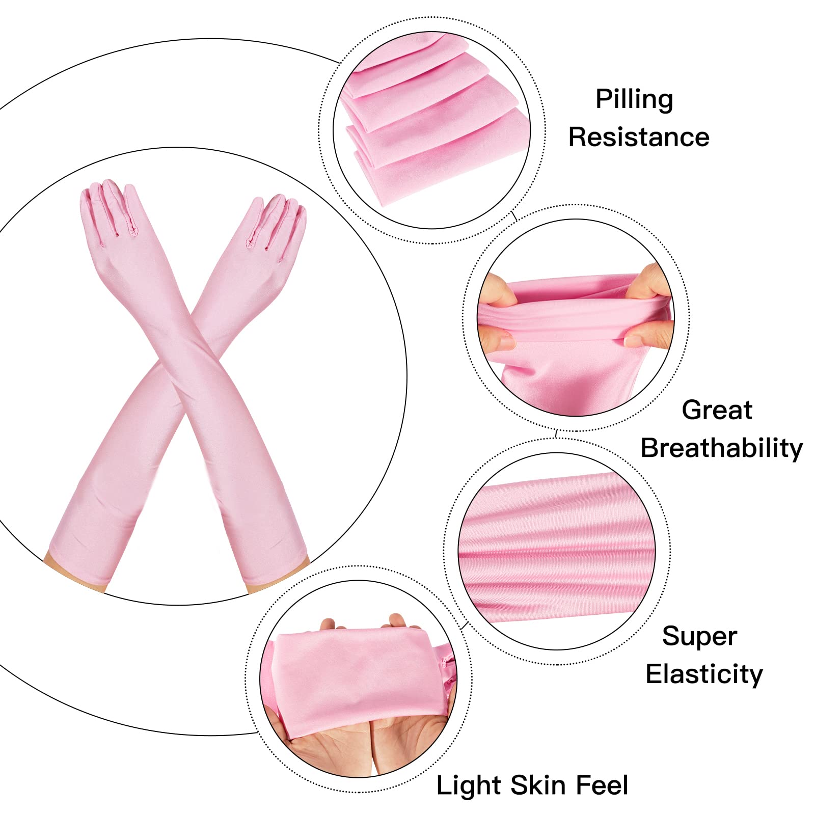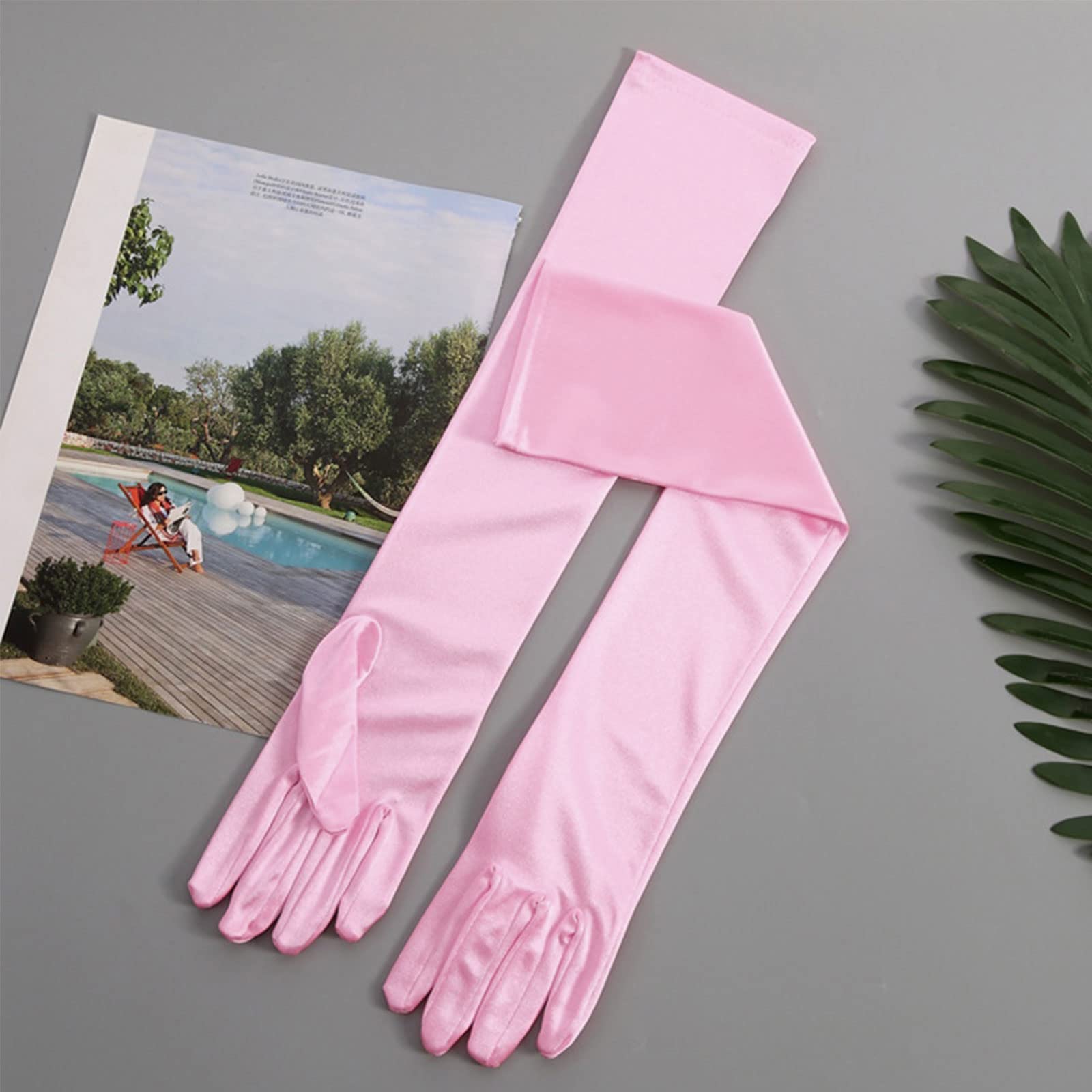 Description Women's White Long Satin Gloves Bridal Dance Gloves For Special Occasion Evening Party, Black, White, Pink, Red Material: Made of 90% Nylon + 10% Spandex, stretchy and easy to put on. Stretch ,soft, smooth, sleek, comfortable to wear The best to hand wash and air dry. Package include: 1 Pair Gloves.