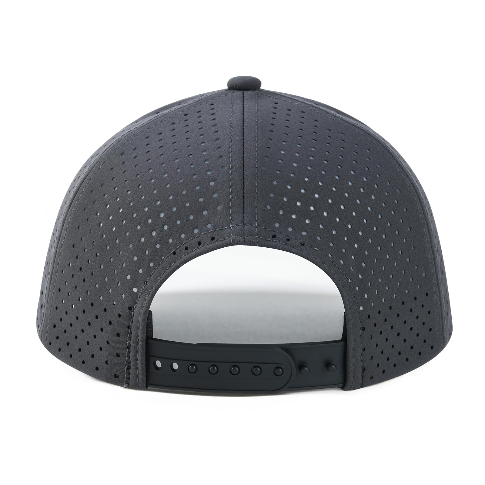 Design: structured front panels, 6-panel cap, curved brim, laser-perforated side & rear panels for breathability, and soft touch snapback closure