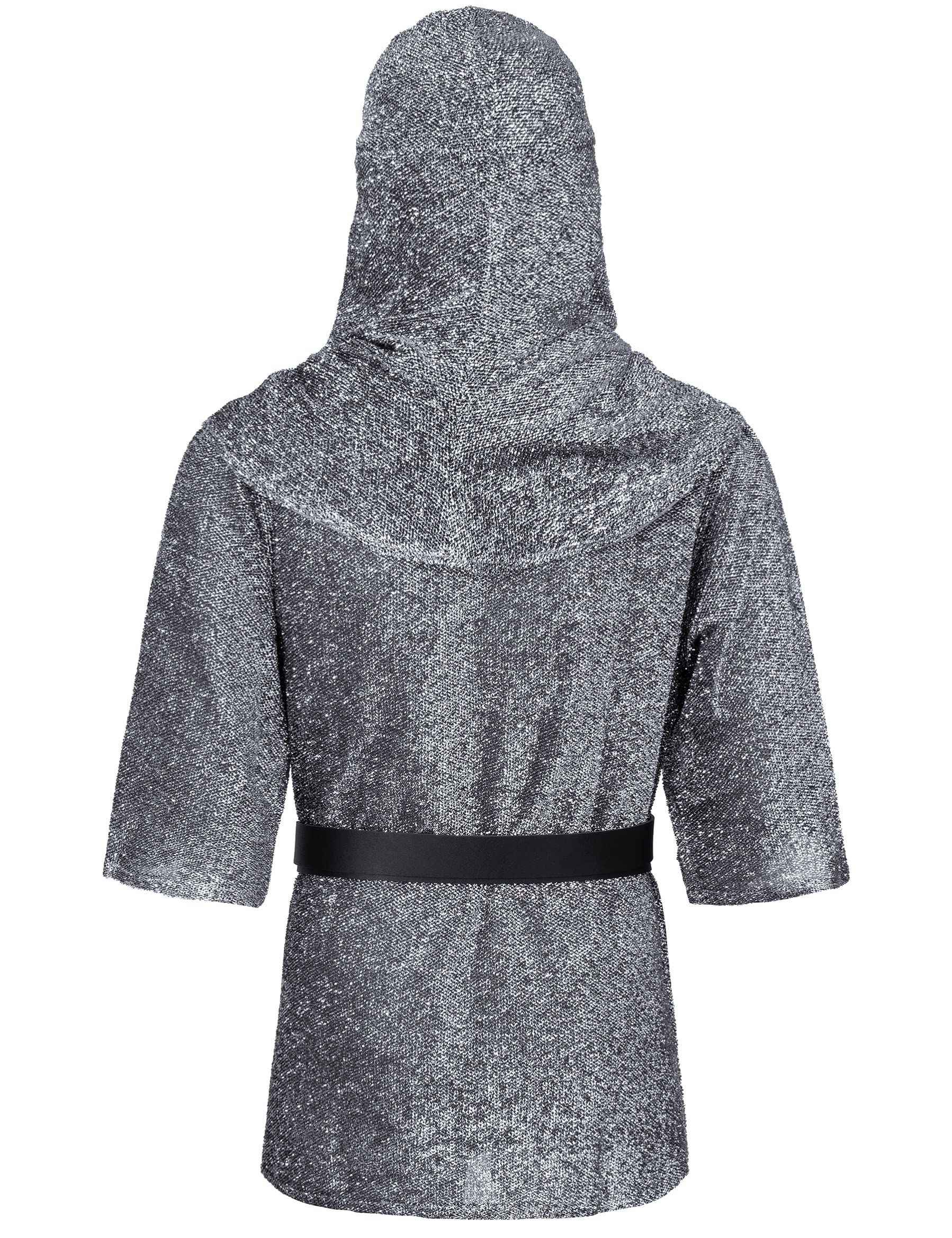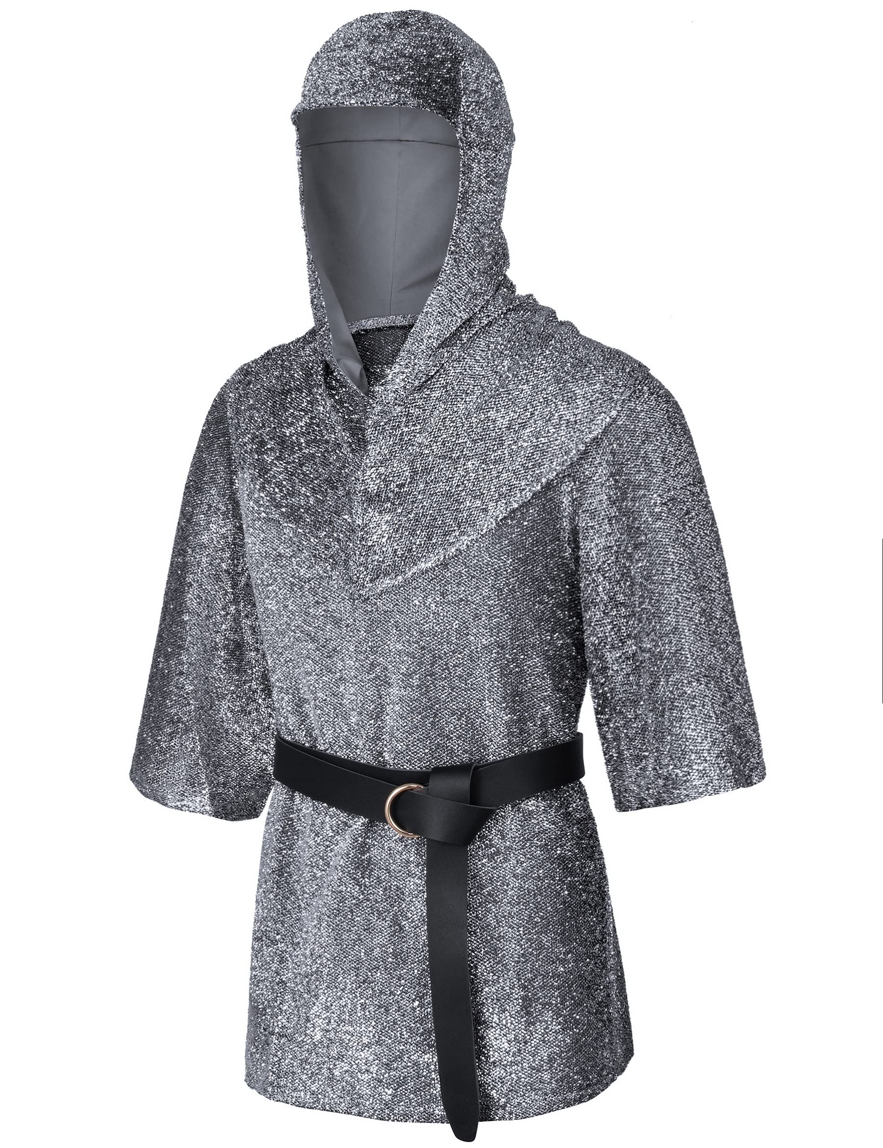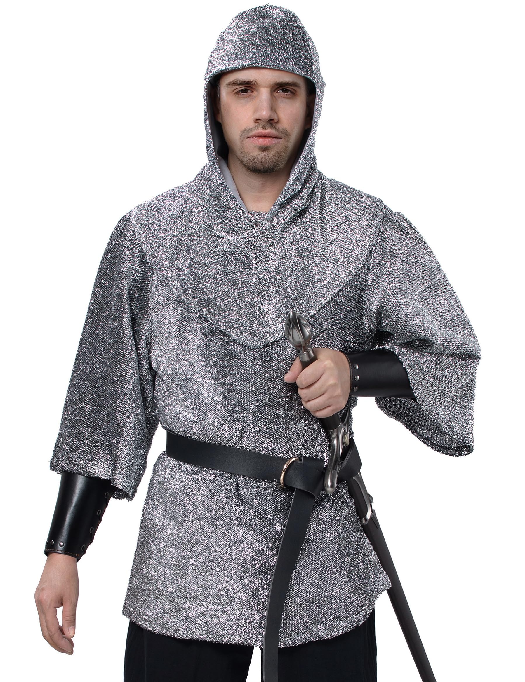 Medieval renaissance chain mail armor tunic outfit halloween shirt and chain mail cowl cosplay costume with bracers waistband prefect for cosplay crusader knight warrior renaissance shirt tunic costumes.