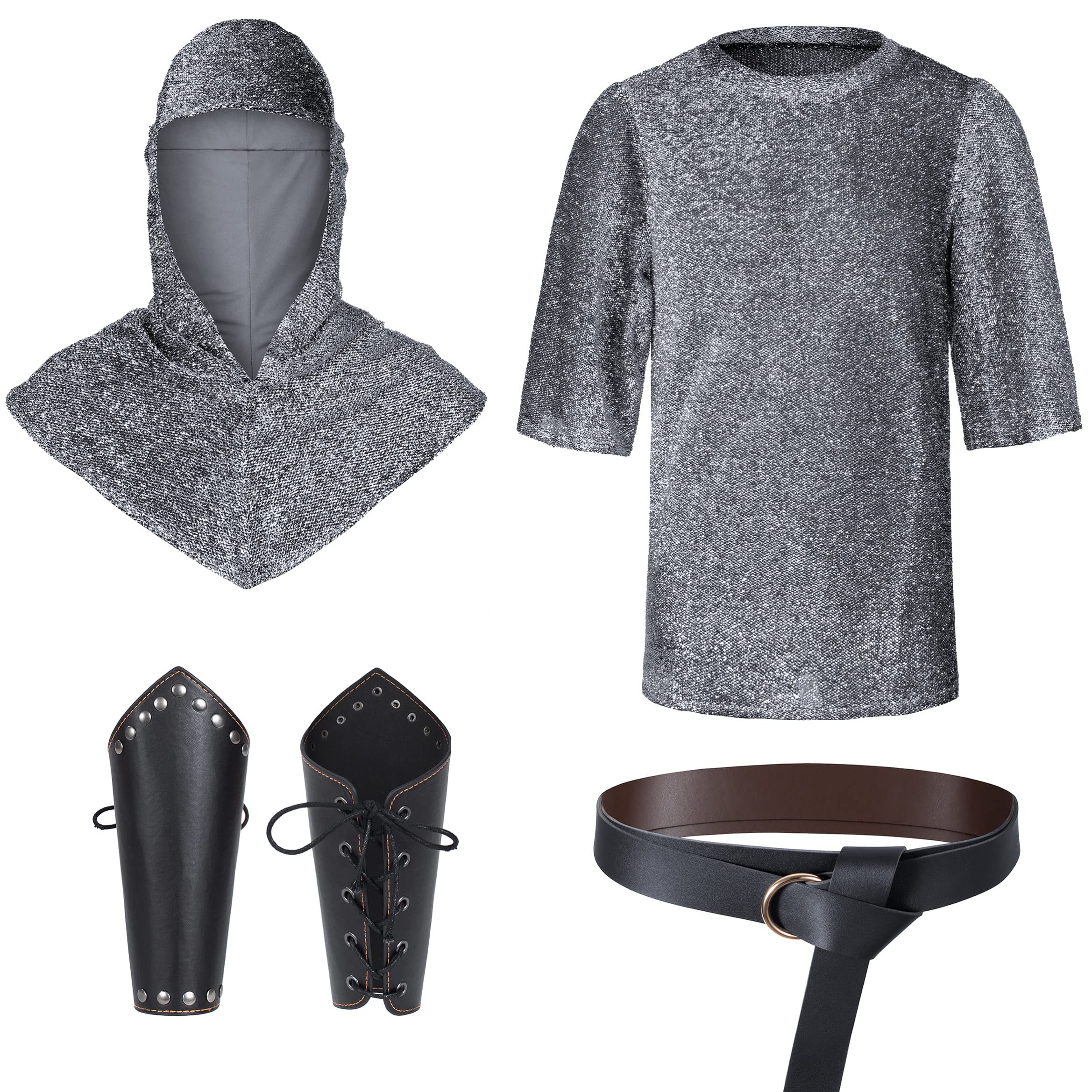 Package includes:3/4 sleeves faux chain mail shirt tunic *1,faux chain mail cowl *1,bracers *2,waist belt *1,-----5 pieces set.